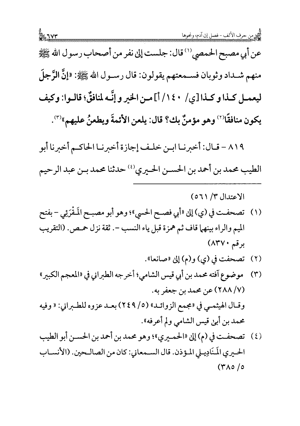 عن أبي مصبح الحمصي (¬١) قال: جلست إلى نفر من أصحاب رسول الله - صلى الله عليه وسلم - منهم شداد وثوبان فسمعتهم يقولون: قال رسول الله - صلى الله عليه وسلم -: "إنَّ الرَّجلَ ليعمل كذا وكذا من الخير وإنَّه لمنافقٌ؛ قالوا: وكيف يكون منافقًا (¬٢) وهو مؤمنٌ بك؟ قال: يلعن الأئمةَ ويطعنُ عليهم" (¬٣).