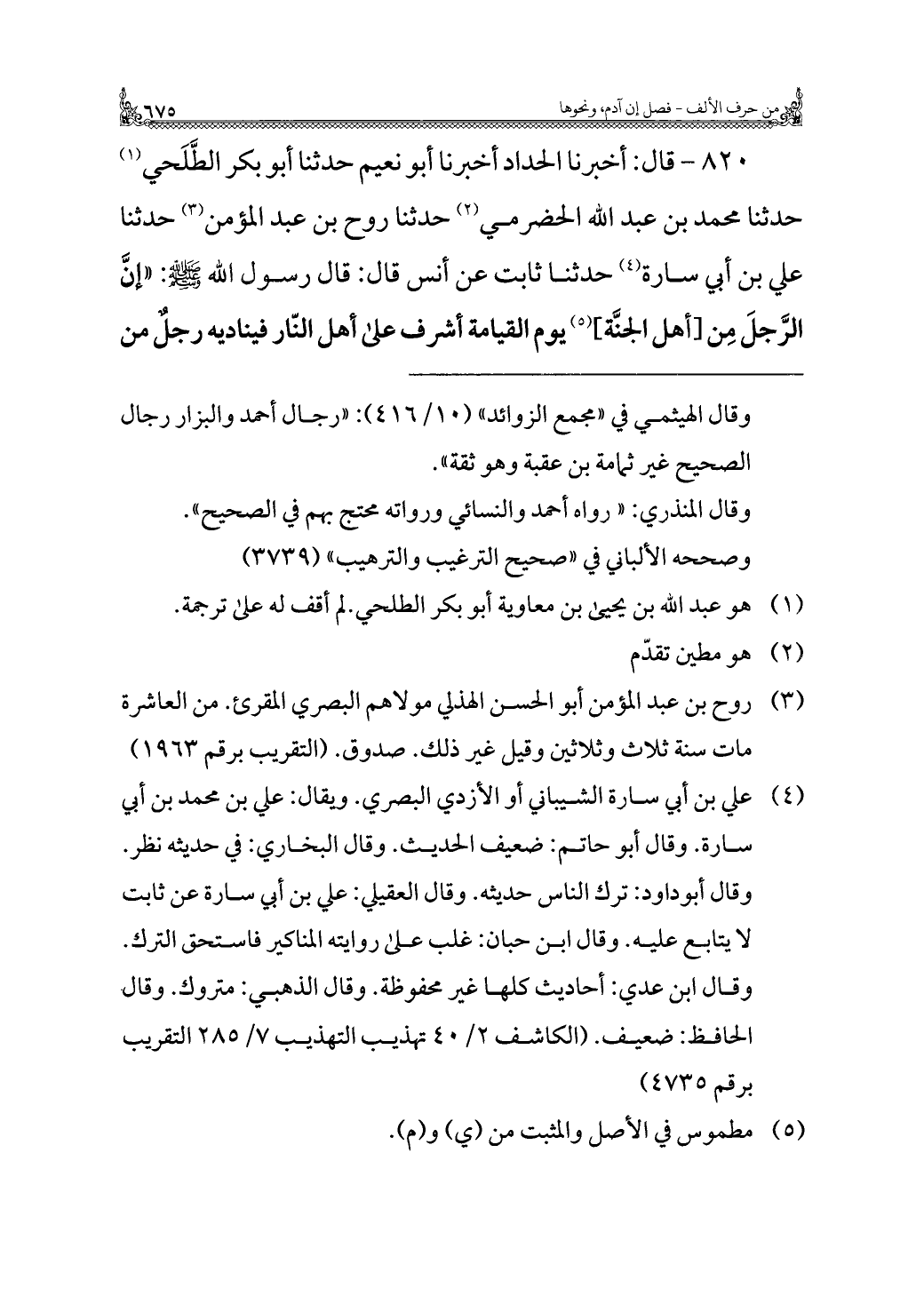 ٨٢٠ - قال: أخبرنا الحداد أخبرنا أبو نعيم حدثنا أبو بكر الطَّلَحي (¬١) حدثنا محمد بن عبد الله الحضرمي (¬٢) حدثنا روح بن عبد المؤمن (¬٣) حدثنا علي بن أبي سارة (¬٤) حدثنا ثابت عن أنس قال: قال رسول الله - صلى الله عليه وسلم -: "إنَّ الرَّجلَ مِن [أهل الجنَّة] (¬٥) يوم القيامة أشرف على أهل النّار فيناديه رجلٌ من