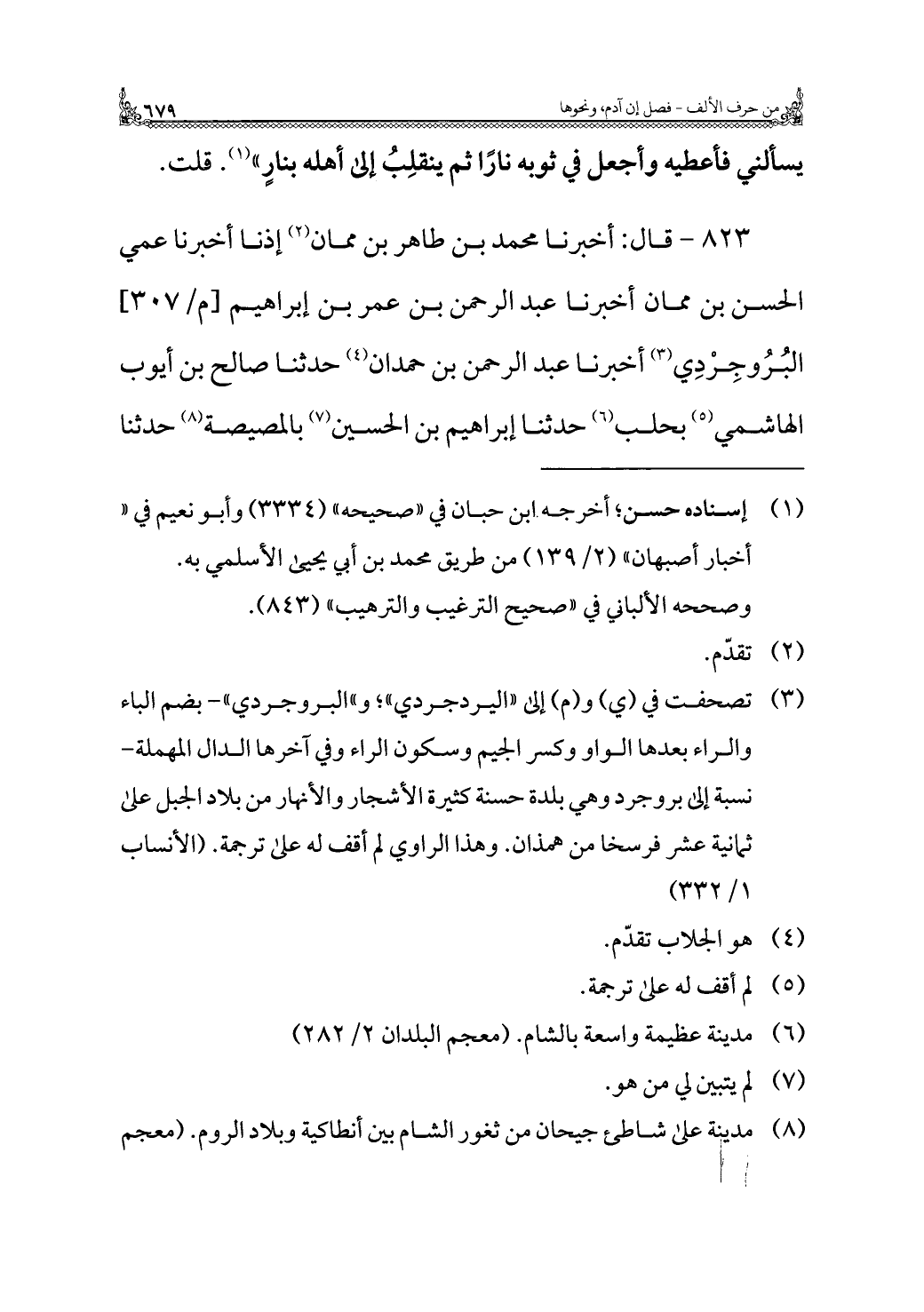 ٨٢٣ - قال: أخبرنا محمد بن طاهر بن ممان (¬٢) إذنا أخبرنا عمي الحسن بن ممان أخبرنا عبد الرحمن بن عمر بن إبراهيم البُرُوجِرْدِي (¬٣) أخبرنا عبد الرحمن بن حمدان (¬٤) حدثنا صالح بن أيوب الهاشمي (¬٥) بحلب (¬٦) حدثنا إبراهيم بن الحسين (¬٧) بالمصيصة (¬٨) حدثنا