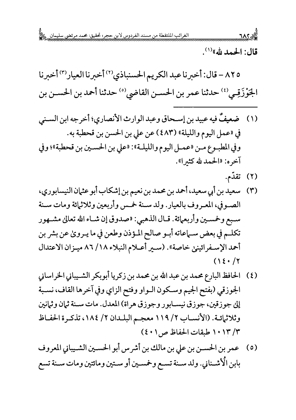 ٨٢٥ - قال: أخبرنا عبد الكريم الحسنباذي (¬٢) أخبرنا العيار (¬٣) أخبرنا الجوْزَقِي (¬٤) حدثنا عمر بن الحسن القاضي (¬٥) حدثنا أحمد بن الحسن بن