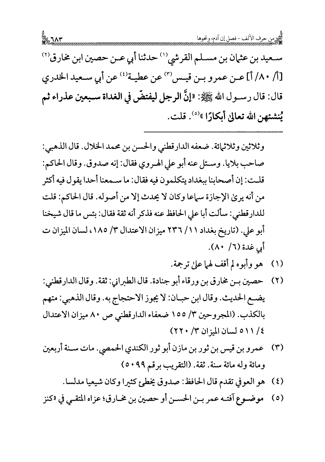 سعيد بن عثمان بن مسلم القرشي (¬١) حدثنا أبي عن حصين بن مخارق (¬٢) عن عمرو بن قيس (¬٣) عن عطية (¬٤) عن أبي سعيد الخدري قال: قال رسول الله - صلى الله عليه وسلم -: "إنَّ الرجل ليفتضّ في الغداة سبعين عذراء ثم يُنشئهن الله تعالى أبكارًا" (¬٥). قلت.