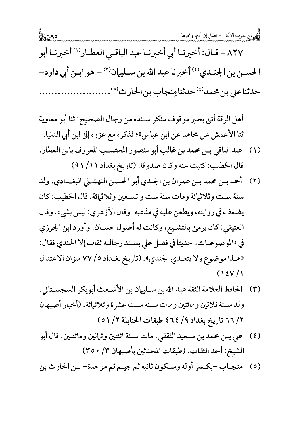 ٨٢٧ - قال: أخبرنا أبي أخبرنا عبد الباقي العطار (¬١) أخبرنا أبو الحسن بن الجندي (¬٢) أخبرنا عبد الله بن سليمان (¬٣) - هو ابن أبي داود - حدثنا علي بن محمد (¬٤) حدثنا مِنجاب بن الحارث (¬٥)