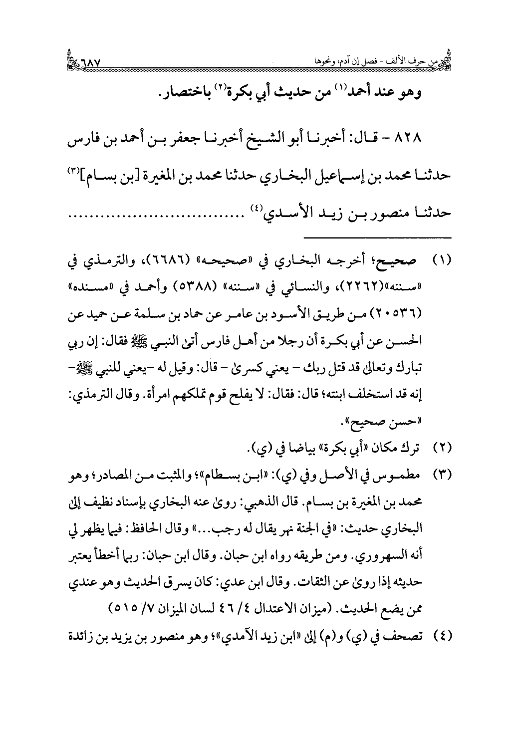 ٨٢٨ - قال: أخبرنا أبو الشيخ أخبرنا جعفر بن أحمد بن فارس حدثنا محمد بن إسماعيل البخاري حدثنا محمد بن المغيرة [بن بسام] (¬٣) حدثنا منصور بن زيد الأسدي (¬٤)