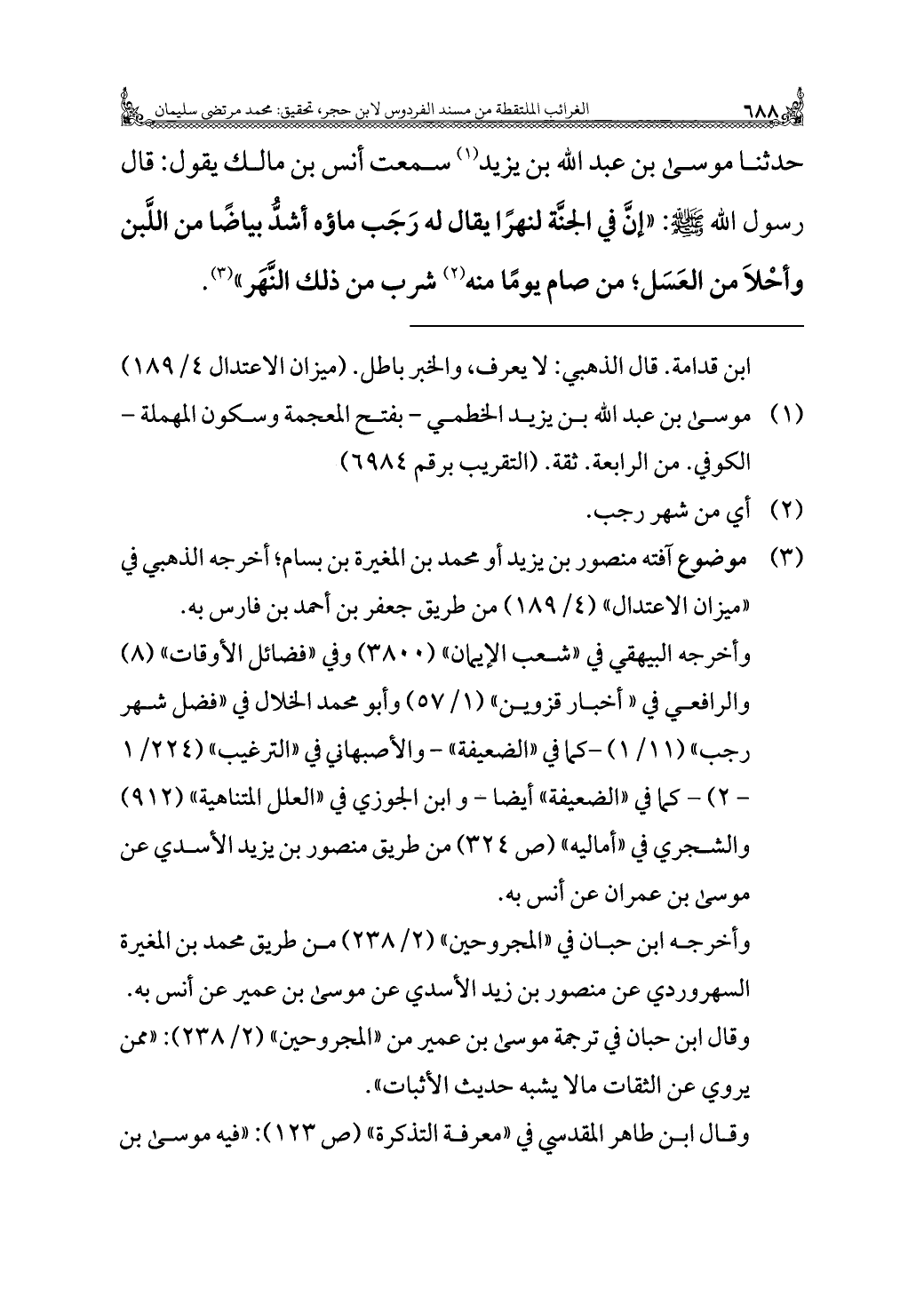 وقال ابن طاهر المقدسي في "معرفة التذكرة" (ص ١٢٣): "فيه موسى بن =