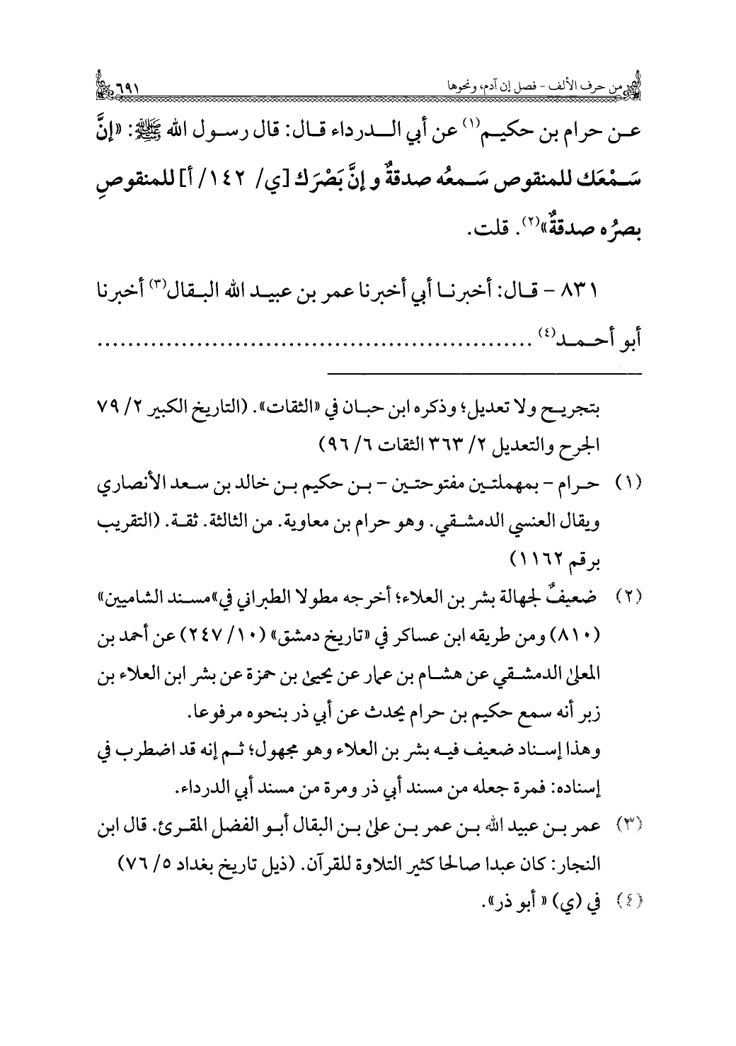 عن حرام بن حكيم (¬١) عن أبي الدرداء قال: قال رسول الله - صلى الله عليه وسلم -: "إنَّ سَمْعَك للمنقوص سَمعُه صدقةٌ وإنَّ بَصْرَك للمنقوصِ بصرُه صدقةٌ" (¬٢). قلت.