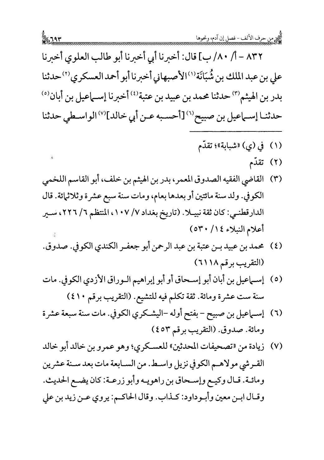 ٨٣٢ - قال: أخبرنا أبي أخبرنا أبو طالب العلوي أخبرنا علي بن عبد الملك بن شُبَانَة (¬١) الأصبهاني أخبرنا أبو أحمد العسكري (¬٢) حدثنا بدر بن الهيثم (¬٣) حدثنا محمد بن عبيد بن عتبة (¬٤) أخبرنا إسماعيل بن أبان (¬٥) حدثنا إسماعيل بن صبيح (¬٦) [أحسبه عن أبي خالد] (¬٧) الواسطي حدثنا