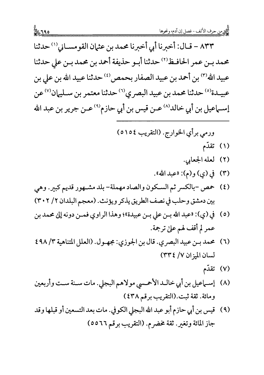 ٨٣٣ - قال: أخبرنا أبي أخبرنا محمد بن عثمان القومساني (¬١) حدثنا محمد بن عمر الحافظ (¬٢) حدثنا أبو حذيفة أحمد بن محمد بن علي حدثنا عبيد الله (¬٣) بن أحمد بن عبيد الصفار بحمص (¬٤) حدثنا عبيد الله بن علي بن عبيدة (¬٥) حدثنا محمد بن عبيد البصري (¬٦) حدثنا معتمر بن سليمان (¬٧) عن إسماعيل بن أبي خالد (¬٨) عن قيس بن أبي حازم (¬٩) عن جرير بن عبد الله