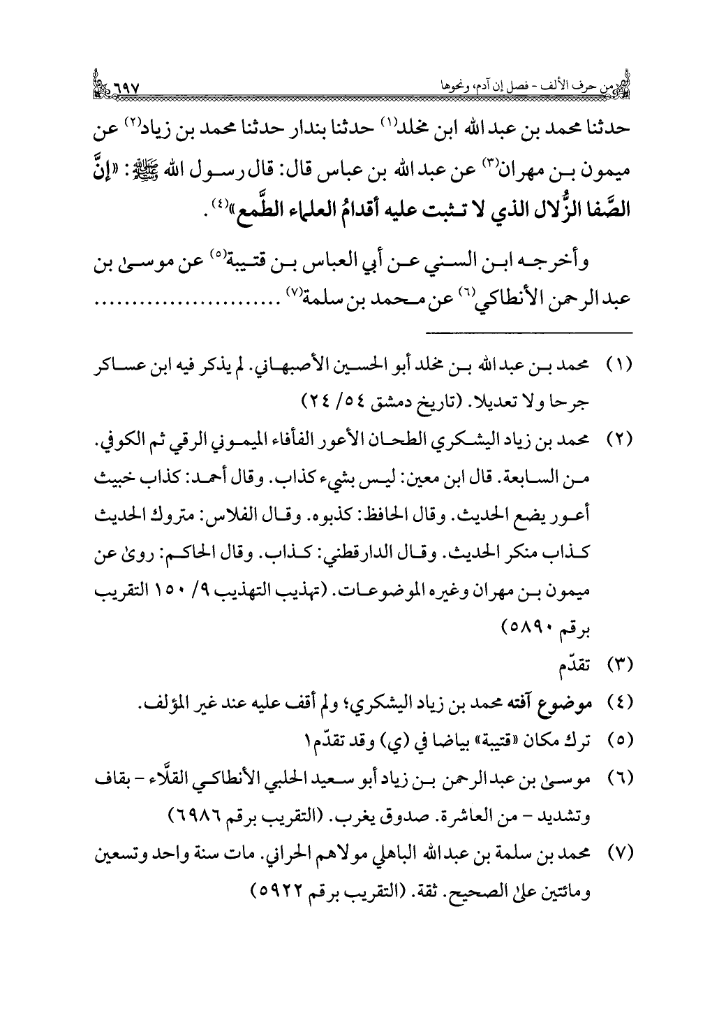 حدثنا محمد بن عبد الله ابن مخلد (¬١) حدثنا بندار حدثنا محمد بن زياد (¬٢) عن ميمون بن مهران (¬٣) عن عبد الله بن عباس قال: قال رسول الله - صلى الله عليه وسلم -: "إنَّ الصَّفا الزُّلال الذي لا تثبت عليه أقدامُ العلماء الطَّمع" (¬٤).