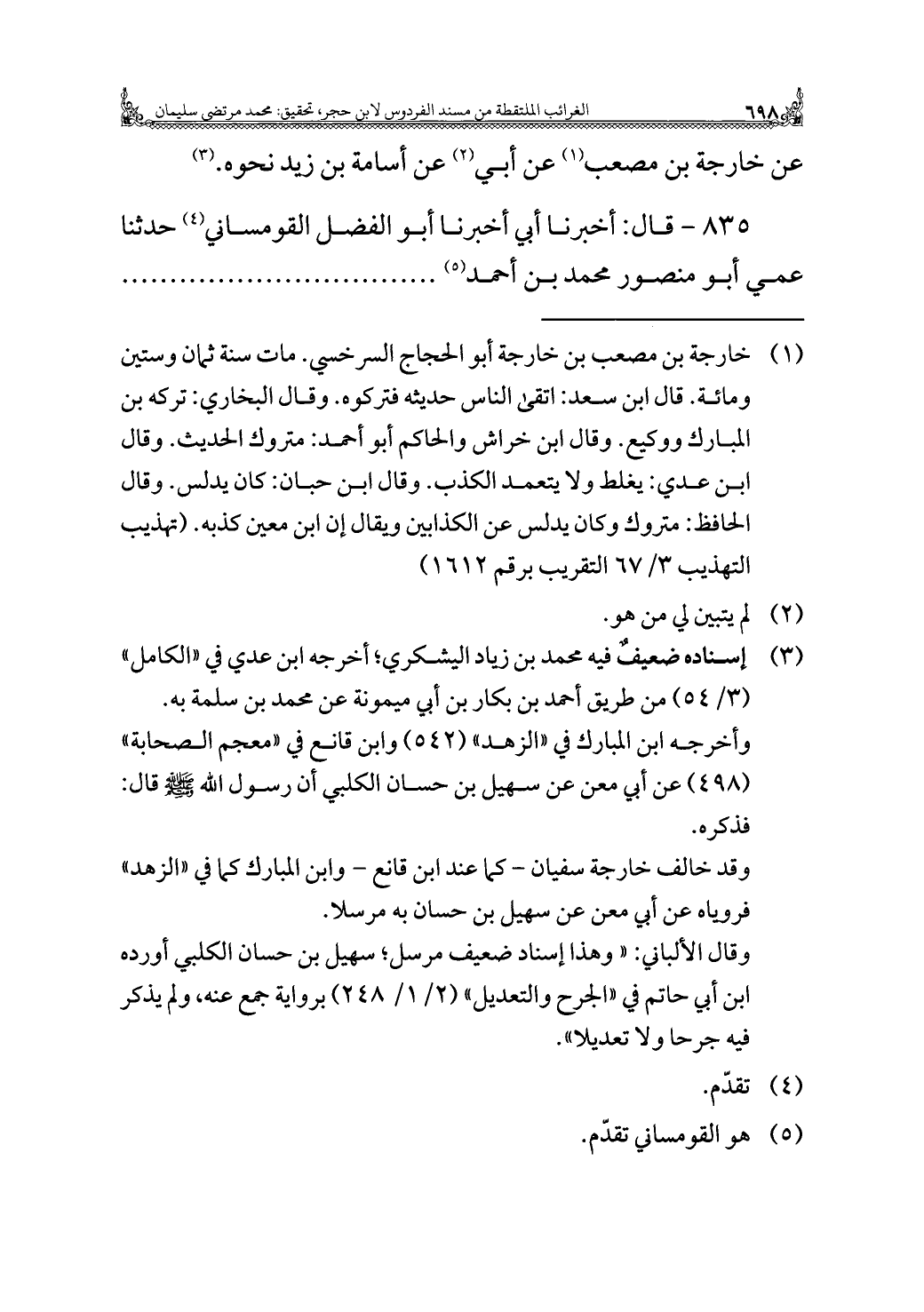 وقد خالف خارجة سفيان - كما عند ابن قانع - وابن المبارك كما في "الزهد" فروياه عن أبي معن عن سهيل بن حسان به مرسلا.