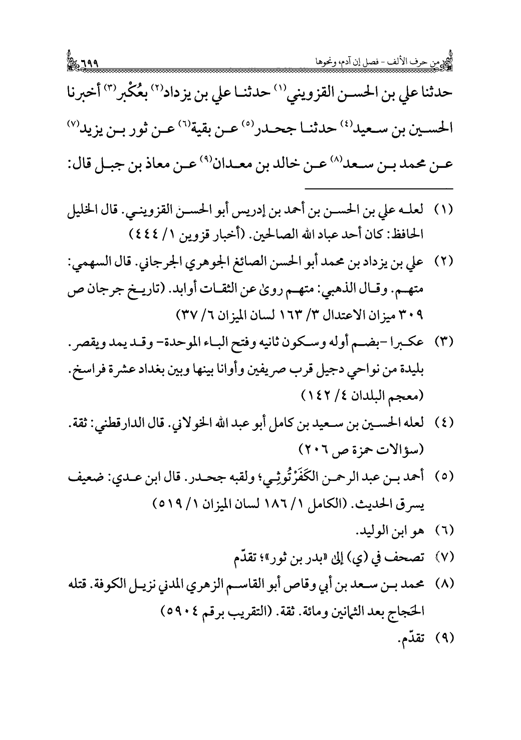 حدثنا علي بن الحسن القزويني (¬١) حدثنا علي بن يزداد (¬٢) بعُكْبر (¬٣) أخبرنا الحسين بن سعيد (¬٤) حدثنا جحدر (¬٥) عن بقية (¬٦) عن ثور بن يزيد (¬٧) عن محمد بن سعد (¬٨) عن خالد بن معدان (¬٩) عن معاذ بن جبل قال: