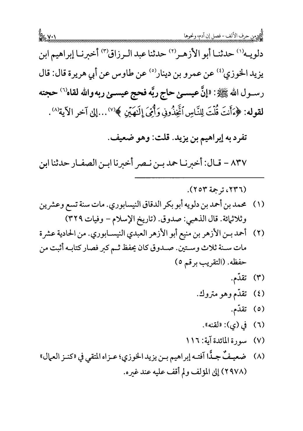 (¬٢) أحمد بن الأزهر بن منيع أبو الأزهر العبدي النيسابوري. من الحادية عشرة مات سنة ثلاث وستين. صدوق كان يحفظ ثم كبر فصار كتابه أثبت من حفظه. (التقريب برقم ٥)