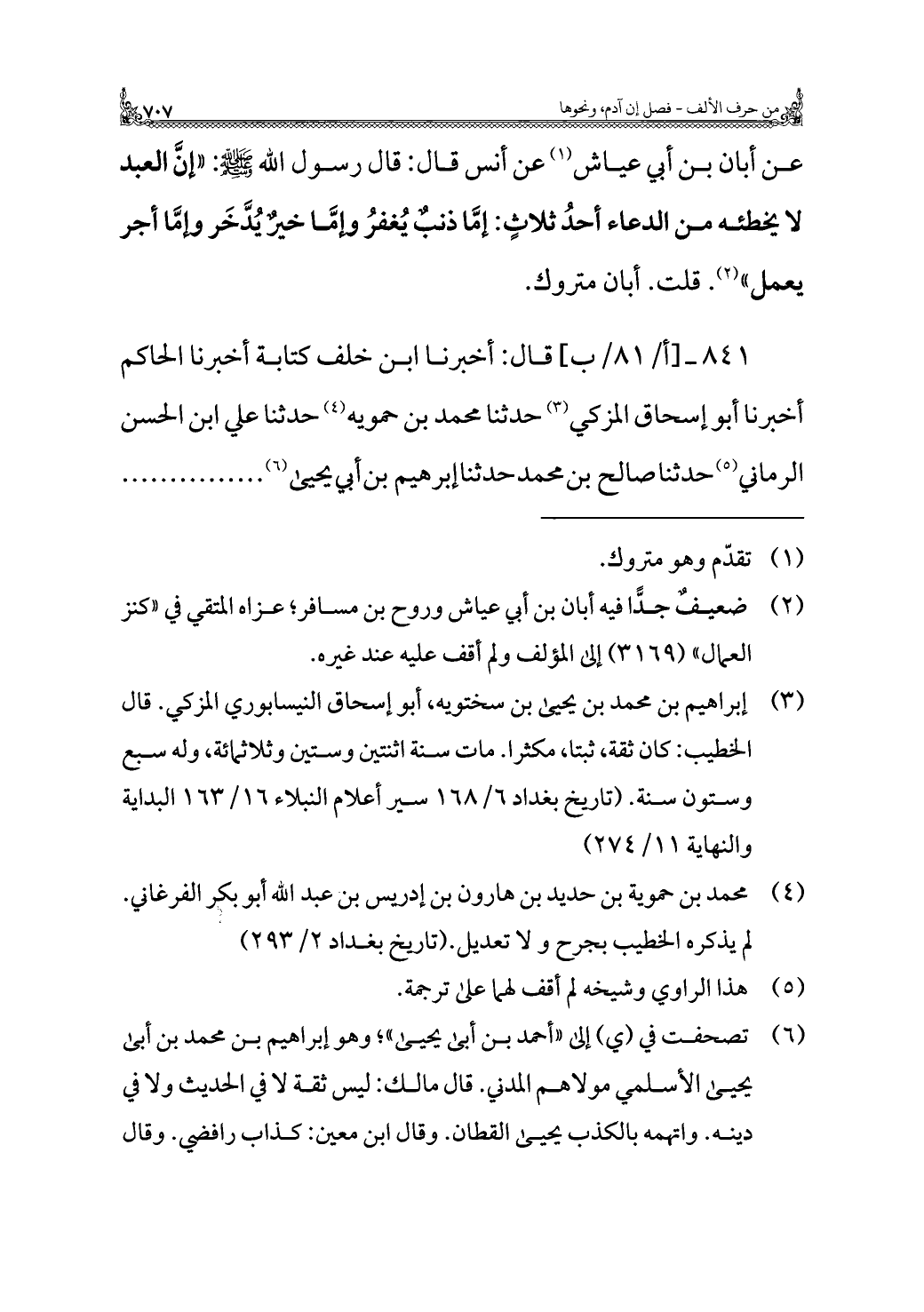 (¬٦) تصحفت في (ي) إلى "أحمد بن أبي يحيى"؛ وهو إبراهيم بن محمد بن أبي يحيى الأسلمي مولاهم المدني. قال مالك: ليس ثقة لا في الحديث ولا في دينه. واتهمه بالكذب يحيى القطان. وقال ابن معين: كذاب رافضي. وقال =
