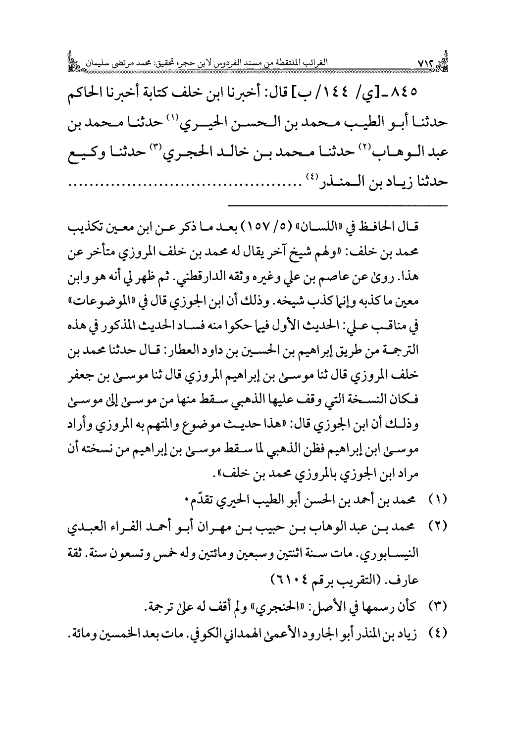 ٨٤٥ - قال: أخبرنا ابن خلف كتابة أخبرنا الحاكم حدثنا أبو الطيب محمَّد بن الحسن الحيري (¬١) حدثنا محمَّد بن عبد الوهاب (¬٢) حدثنا محمَّد بن خالد الحجري (¬٣) حدثنا وكيع حدثنا زياد بن المنذر (¬٤)