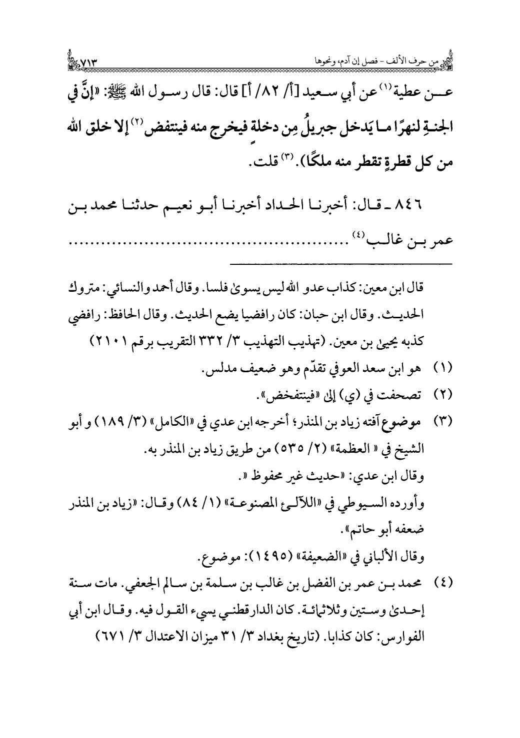 عن عطية (¬١) عن أبي سعيد قال: قال رسول الله - صلى الله عليه وسلم -: "إنَّ في الجنةِ لنهرًا ما يَدخل جبريلُ مِن دخلةٍ فيخرج منه فينتفض (¬٢) إلا خلق الله من كل قطرةٍ تقطر منه ملكًا). (¬٣) قلت.