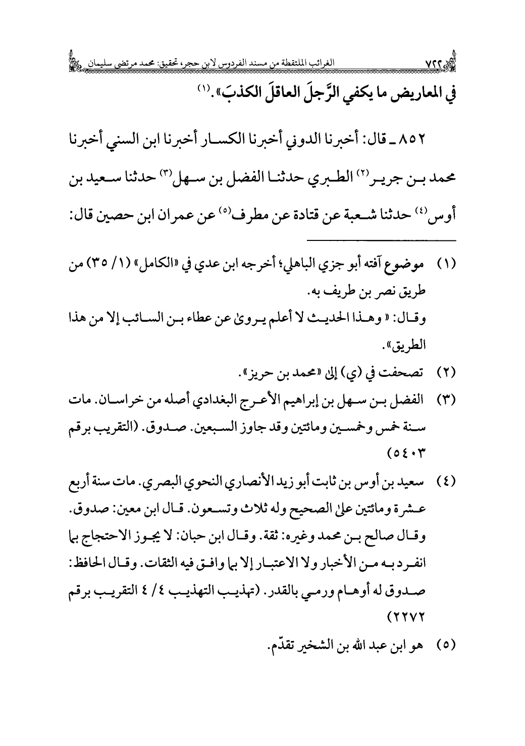 ٨٥٢ - قال: أخبرنا الدوني أخبرنا الكسار أخبرنا ابن السني أخبرنا محمَّد بن جرير (¬٢) الطبري حدثنا الفضل بن سهل (¬٣) حدثنا سعيد بن أوس (¬٤) حدثنا شعبة عن قتادة عن مطرف (¬٥) عن عمران بن حصين قال: