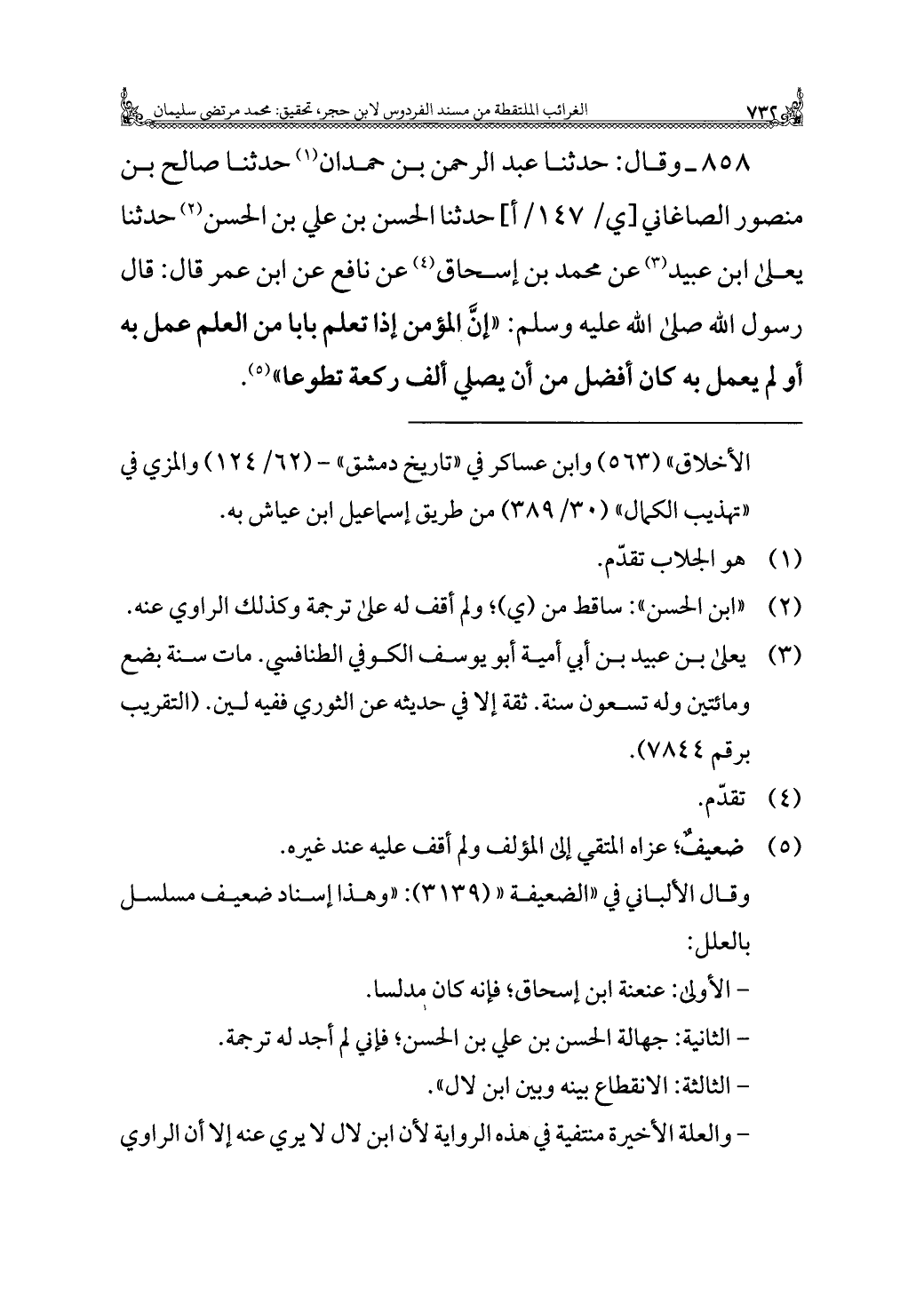 ٨٥٨ - وقال: حدثنا عبد الرحمن بن حمدان (¬١) حدثنا صالح بن منصور الصاغاني حدثنا الحسن بن علي بن الحسن (¬٢) حدثنا يعلى بن عبيد (¬٣) عن محمَّد بن إسحاق (¬٤) عن نافع عن ابن عمر قال: قال رسول الله - صلى الله عليه وسلم -: "إنَّ المؤمن إذا تعلم بابا من العلم عمل به أو لم يعمل به كان أفضل من أن يصلي ألف ركعة تطوعًا" (¬٥).