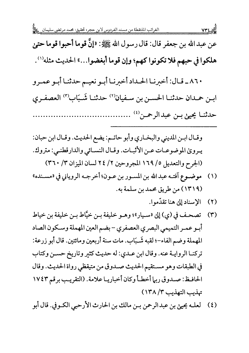 ٨٦٠ - قال: أخبرنا الحداد أخبرنا أبو نعيم حدثنا أبو عمرو بن حمدان حدثنا الحسن بن سفيان (¬٢) حدثنا شَبَاب (¬٣) العصفري حدثنا يحيى بن عبد الرحمن (¬٤)