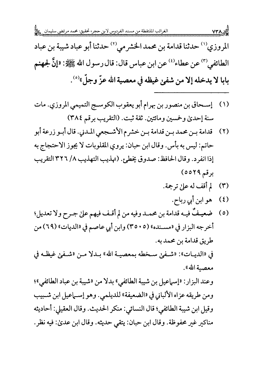 (¬٢) قدامة بن محمَّد بن قدامة بن خشرم الأشجعي المدني. قال أبو زرعة أبو حاتم: ليس به بأس. وقال ابن حبَّان: يروي المقلوبات لا يجوز الاحتجاج به إذا انفرد. وقال الحافظ: صدوق يخطئ. (تهذيب التهذيب ٨/ ٣٢٦ التقريب برقم ٥٥٢٩)