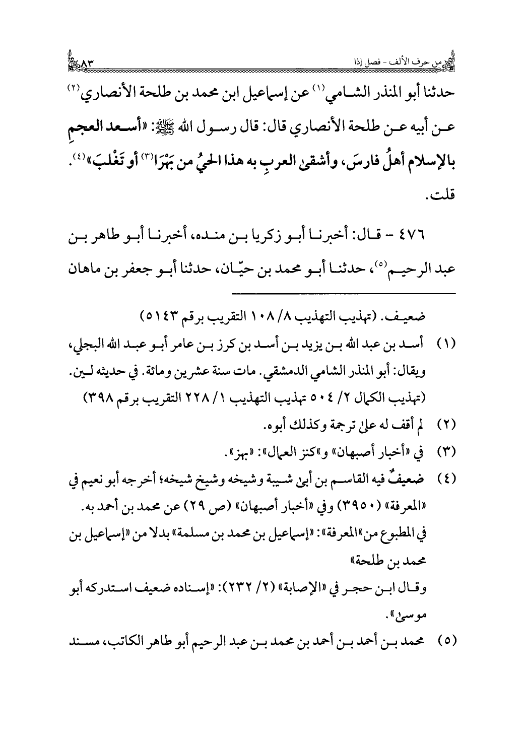 حدثنا أبو المنذر الشامي (¬١) عن إسماعيل ابن محمد بن طلحة الأنصاري (¬٢) عن أبيه عن طلحة الأنصاري قال: قال رسول الله - صلى الله عليه وسلم -: "أسعد العجمِ بالإسلام أهلُ فارسَ، وأشقى العربِ به هذا الحيُ من بَهْرَا (¬٣) أو تَغْلبَ" (¬٤). قلت.
