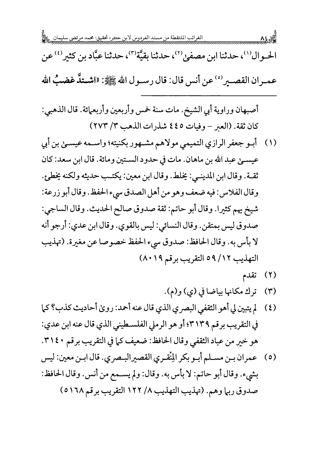 (¬٤) لم يتبين لي أهو الثقفي البصري الذي قال عنه أحمد: روى أحاديث كذب؟ كما في التقريب برقم ٣١٣٩؛ أو هو الرملي الفلسطيني الذي قال عنه ابن عدي: هو خير من عباد الثقفي وقال الحافظ: ضعيف كما في التقريب برقم ٣١٤٠.