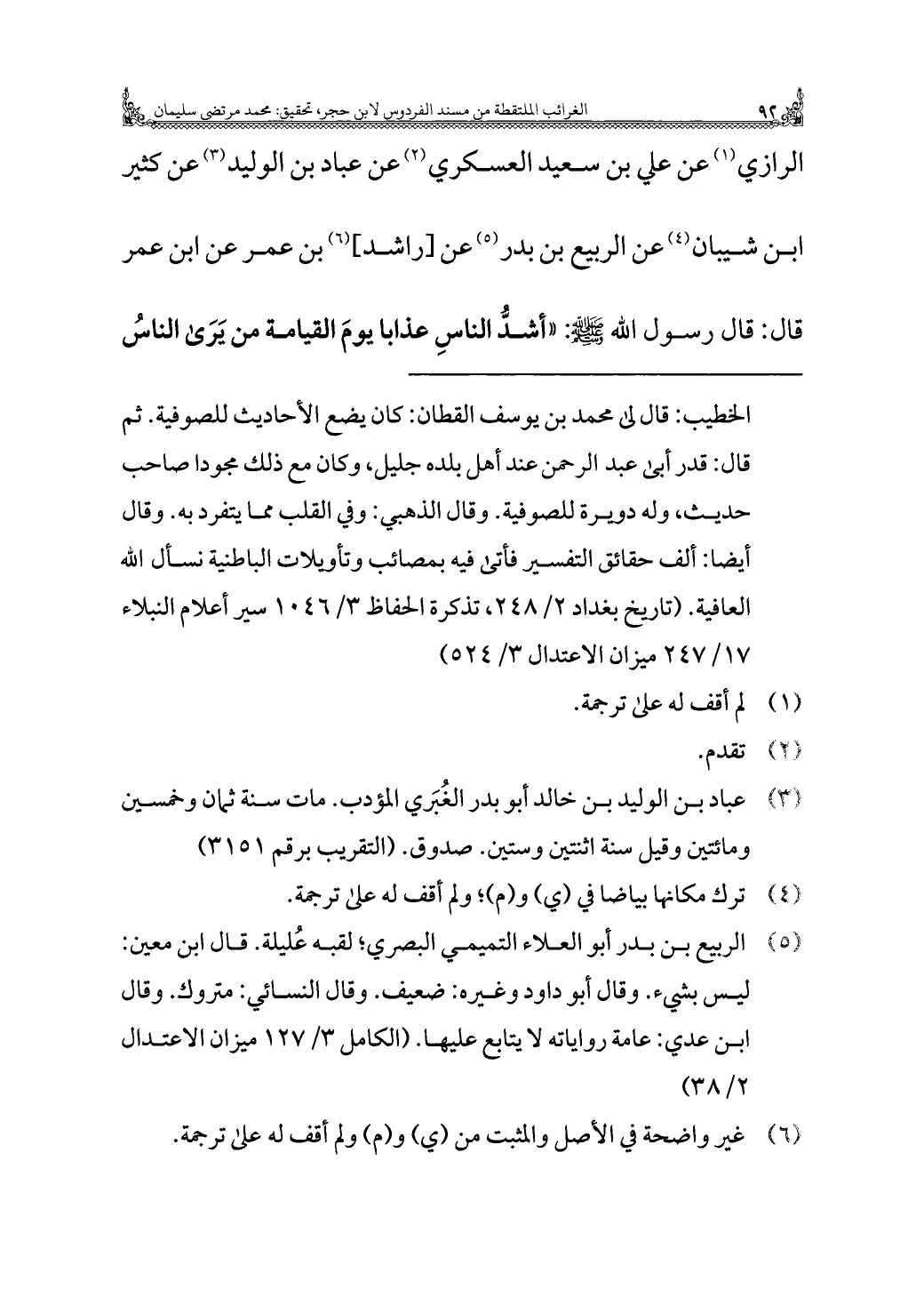 الرازي (¬١) عن علي بن سعيد العسكري (¬٢) عن عباد بن الوليد (¬٣) عن كثير ابن شيبان (¬٤) عن الربيع بن بدر (¬٥) عن [راشد] (¬٦) بن عمر عن ابن عمر قال: قال رسول الله - صلى الله عليه وسلم -: "أشدُّ الناسِ عذابا يومَ القيامة من يَرَى الناسُ