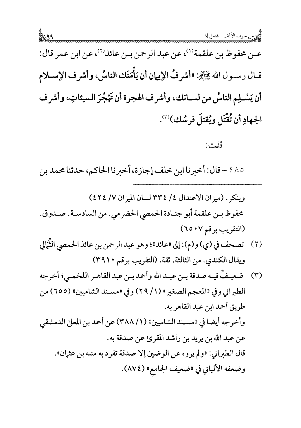 عن محفوظ بن علقمة (¬١)، عن عبد الرحمن بن عائذ (¬٢)، عن ابن عمر قال: قال رسول الله - صلى الله عليه وسلم -: "أشرفُ الإيمان أن يَأْمَنَك الناسُ، وأشرف الإسلام أن يَسْلِم الناسُ من لسانك، وأشرف الهجرة أن تَهْجُرَ السيئات، وأشرف الجهادِ أن تُقْتَل ويُقتلَ فرسُك) (¬٣).