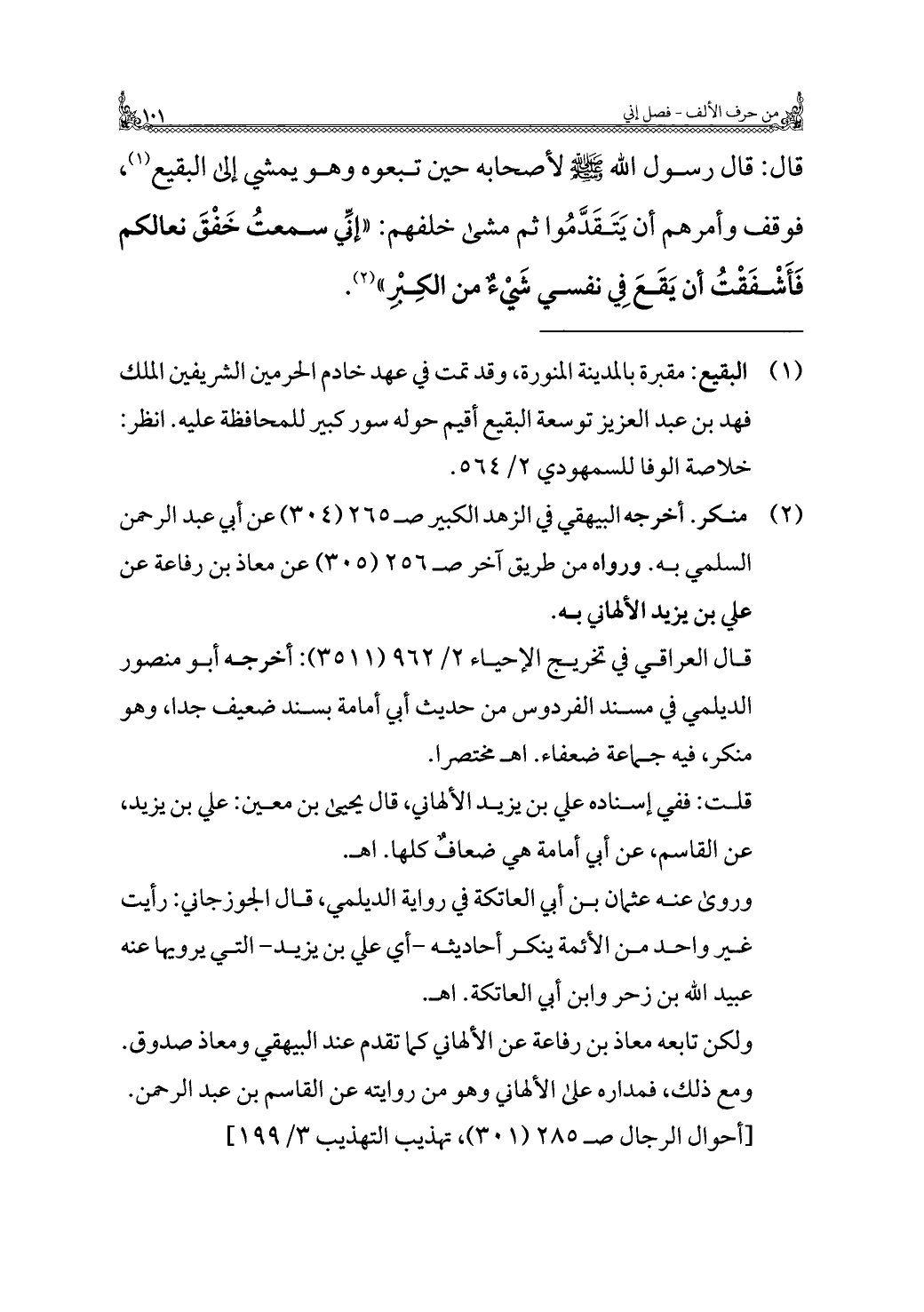ولكن تابعه معاذ بن رفاعة عن الألهاني كما تقدم عند البيهقي ومعاذ صدوق. ومع ذلك، فمداره على الألهاني وهو من روايته عن القاسم بن عبد الرحمن. [أحوال الرجال صـ ٢٨٥ (٣٠١)، تهذيب التهذيب ٣/ ١٩٩]