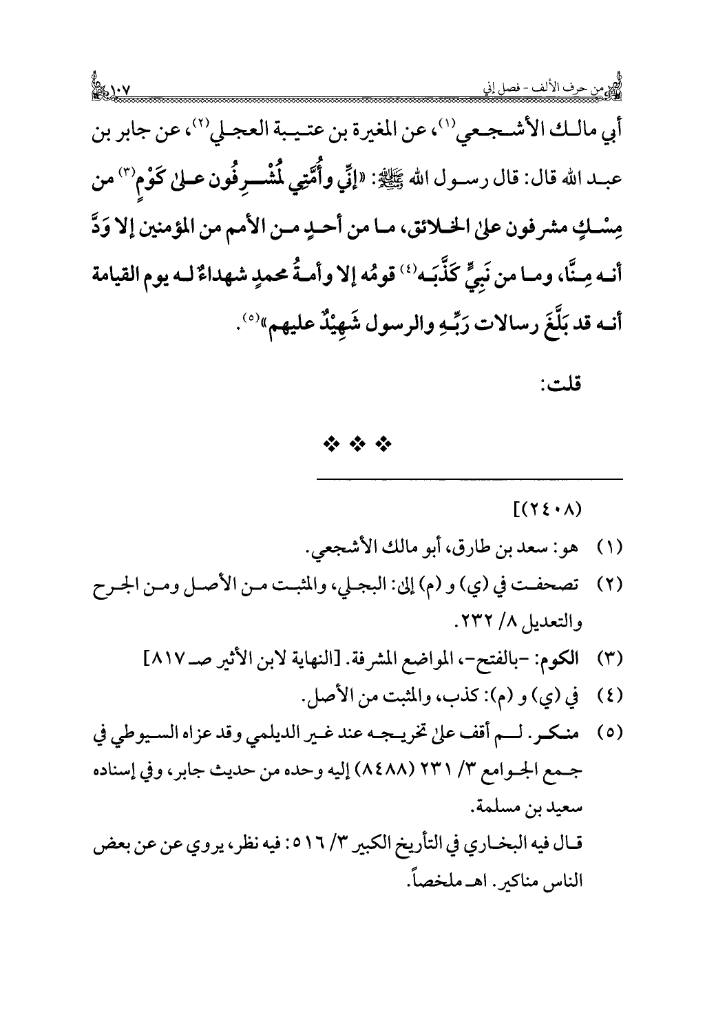 أبي مالك الأشجعي (¬١)، عن المغيرة بن عتيبة العجلي (¬٢)، عن جابر بن عبد الله قال: قال رسول الله - صلى الله عليه وسلم -: "إنِّي وأُمَّتي لمُشْرِفُون على كَوْمٍ (¬٣) من مِسْكٍ مشرفون على الخلائق، ما من أحدٍ من الأمم من المؤمنين إلا وَدَّ أنه مِنَّا، وما من نَبِيٍّ كذَّبَه (¬٤) قومُه إلا وأمةُ محمدٍ شهداءٌ له يوم القيامة أنه قد بَلَّغَ رسالات رَبّهِ والرسول شَهِيْدٌ عليهم" (¬٥).