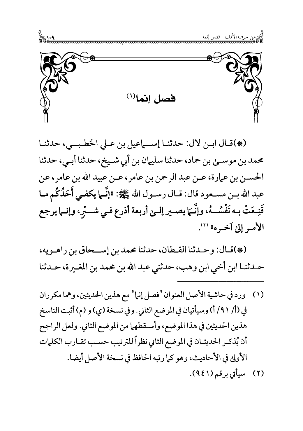 (¬١) ورد في حاشية الأصل العنوان "فصل إنما" مع هذين الحديثين، وهما مكرران في (أ/ ٩١/ أ) وسيأتيان في الموضع الثاني. وفي نسخة (ي) و (م) أثبت الناسخ هذين الحديثين في هذا الموضع، وأسقطهما من الموضع الثاني. ولعل الراجح أن يُذكر الحديثان في الموضع الثاني نظرًا للترتيب حسب تقارب الكلمات الأولى في الأحاديث، وهو كما رتبه الحافظ في نسخة الأصل أيضا.