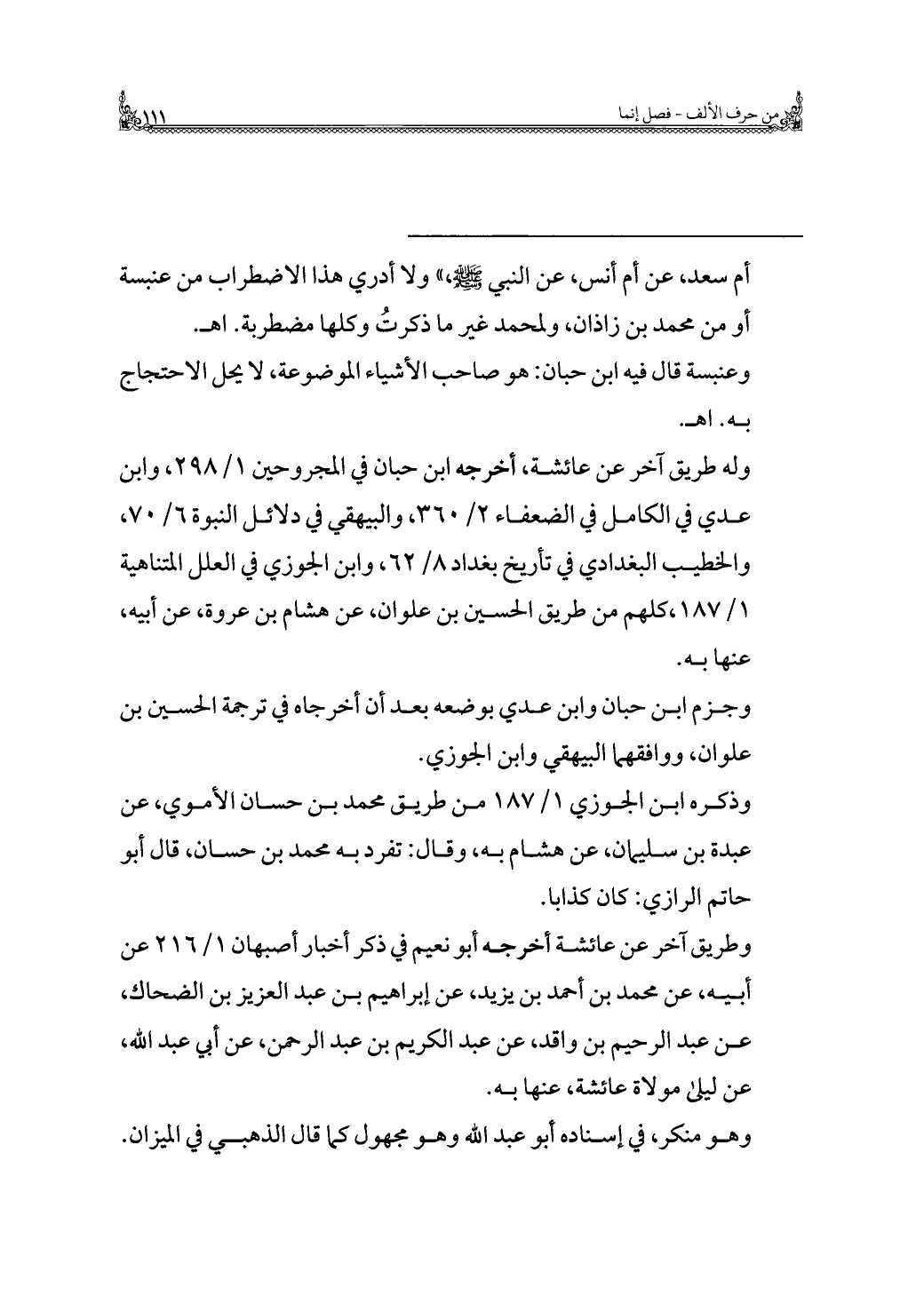 = أم سعد، عن أم أنس، عن النبي - صلى الله عليه وسلم -، " ولا أدري هذا الاضطراب من عنبسة أو من محمد بن زاذان، ولمحمد غير ما ذكرتُ وكلها مضطربة. اهـ.