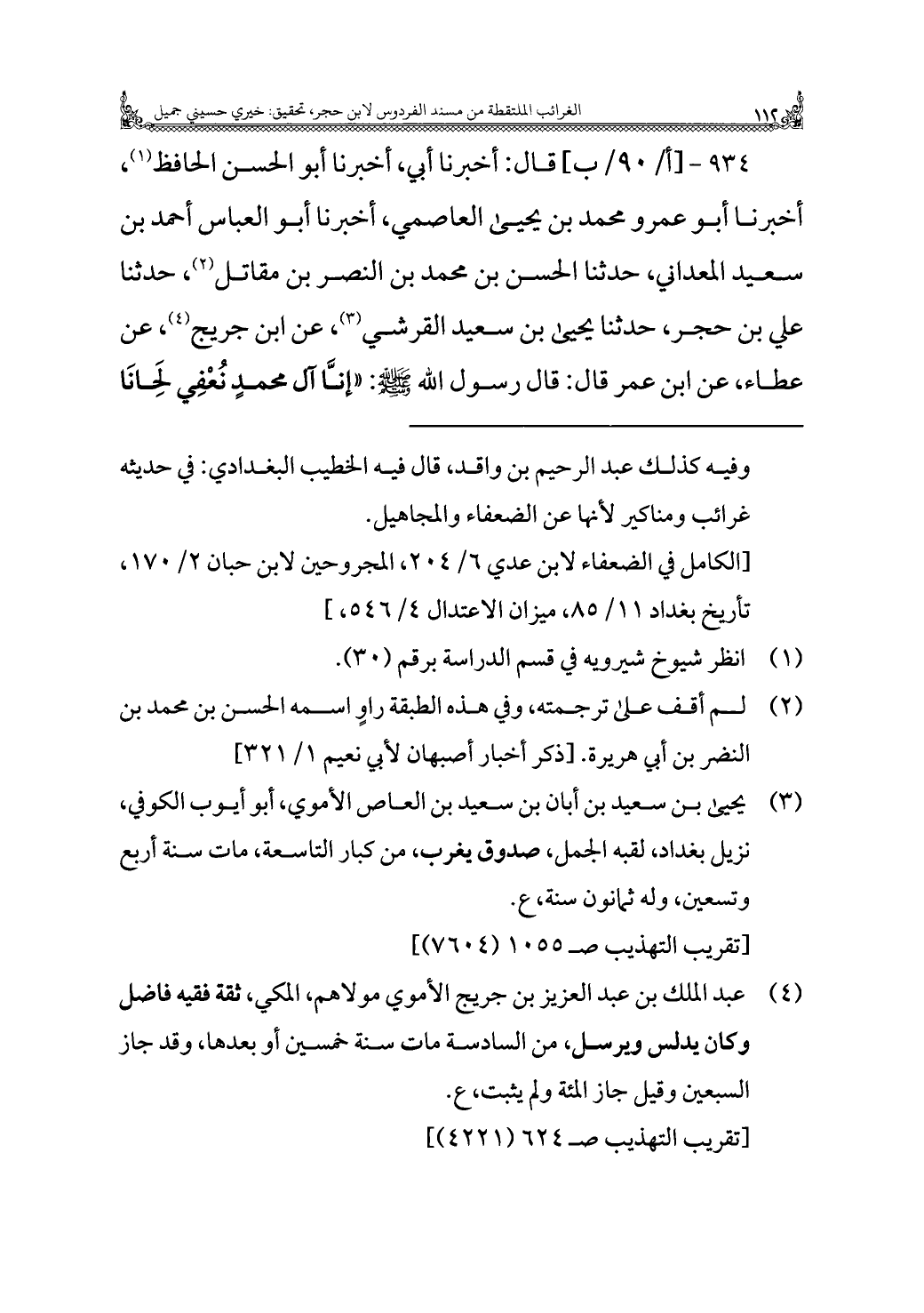 ٩٣٤ - قال: أخبرنا أبي، أخبرنا أبو الحسن الحافظ (¬١)، أخبرنا أبو عمرو محمد بن يحيى العاصمي، أخبرنا أبو العباس أحمد بن سعيد المعداني، حدثنا الحسن بن محمد بن النصر بن مقاتل (¬٢)، حدثنا علي بن حجر، حدثنا يحيى بن سعيد القرشي (¬٣)، عن ابن جريج (¬٤)، عن عطاء، عن ابن عمر قال: قال رسول الله - صلى الله عليه وسلم -: "إنَّا آل محمدٍ نُعْفِي لحِانَا