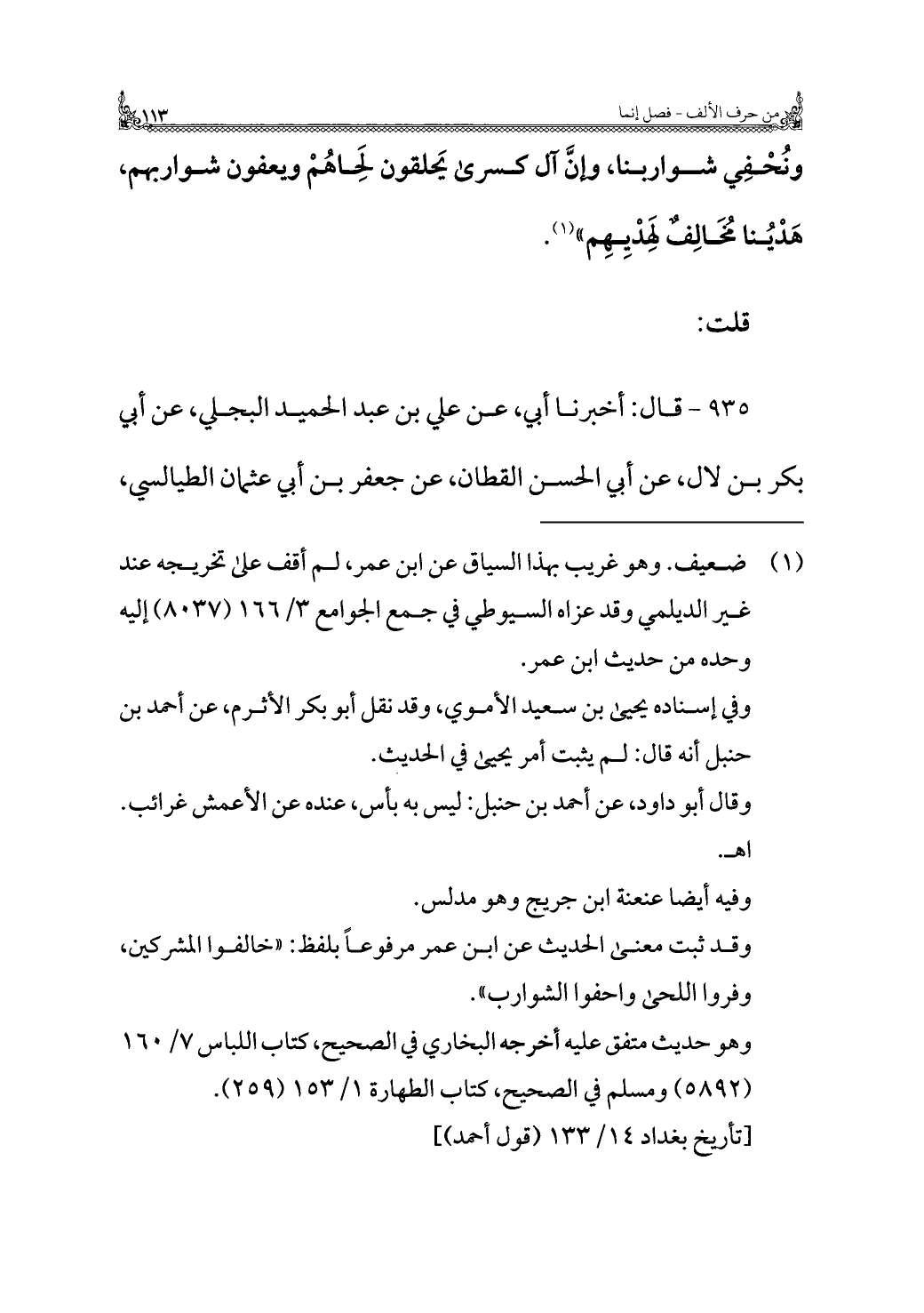 ونُحْفِي شواربنا، وإنَّ آل كسرى يَحلقون لحِاهُمْ ويعفون شواربهم، هَدْيُنا لمحالِفٌ لهِدْيِهِم" (¬١).