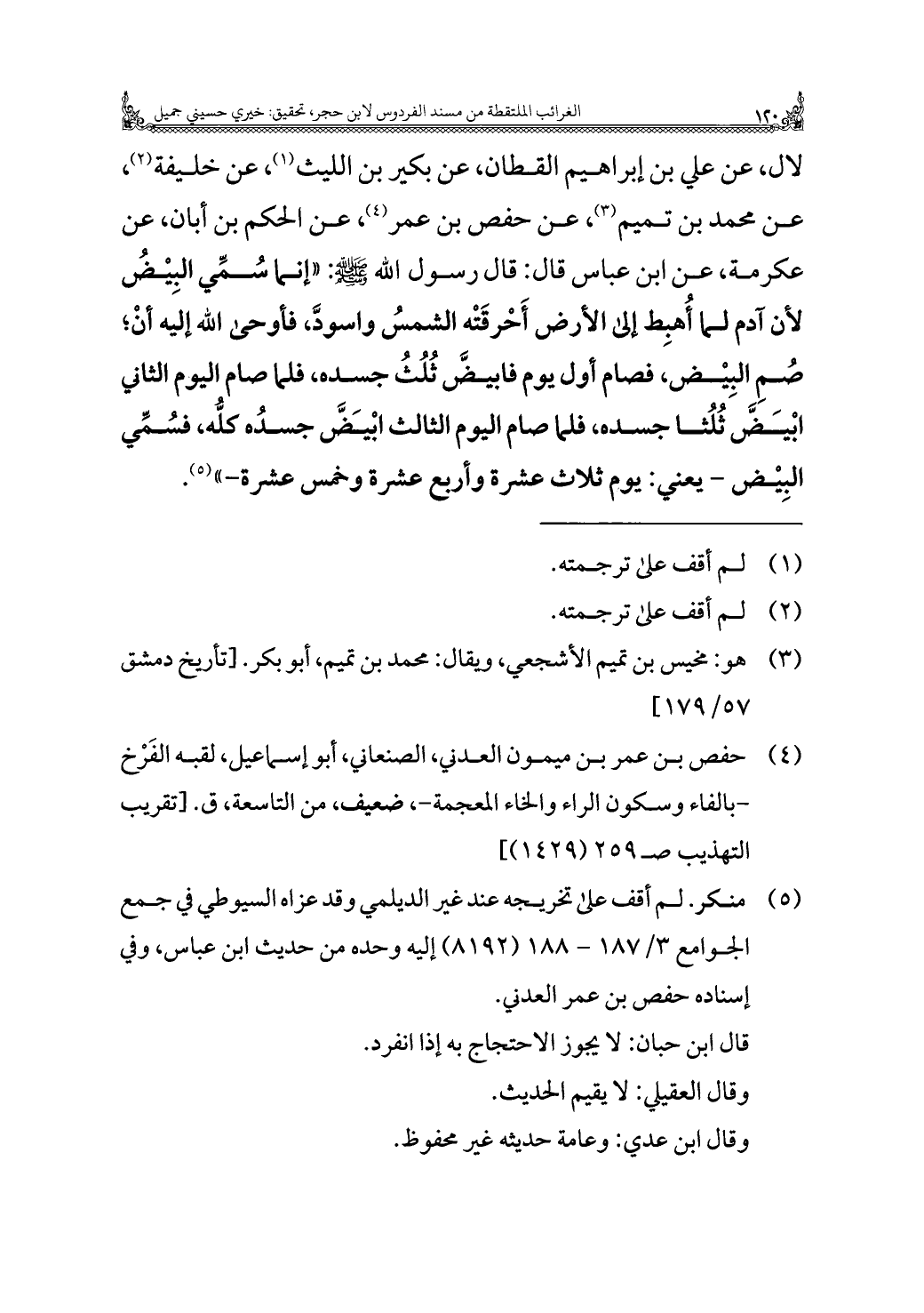 لال، عن علي بن إبراهيم القطان، عن بكير بن الليث (¬١)، عن خليفة (¬٢)، عن محمد بن تميم (¬٣)، عن حفص بن عمر (¬٤)، عن الحكم بن أبان، عن عكرمة، عن ابن عباس قال: قال رسول الله - صلى الله عليه وسلم -: "إنما سُمِّي البِيْضُ لأن آدم لما أُهبِط إلى الأرض أَحْرقَتْه الشمسُ واسودَّ، فأوحى الله إليه أنْ؛ صُمِ البِيْض، فصام أول يوم فابيضَّ ثُلُثُ جسده، فلما صام اليوم الثاني ابْيَضَّ ثُلُثا جسده، فلما صام اليوم الثالث ابْيَضَّ جسدُه كلُّه، فسُمِّي البِيْض - يعني: يوم ثلاث عشرة وأربع عشرة وخمس عشرة - " (¬٥).