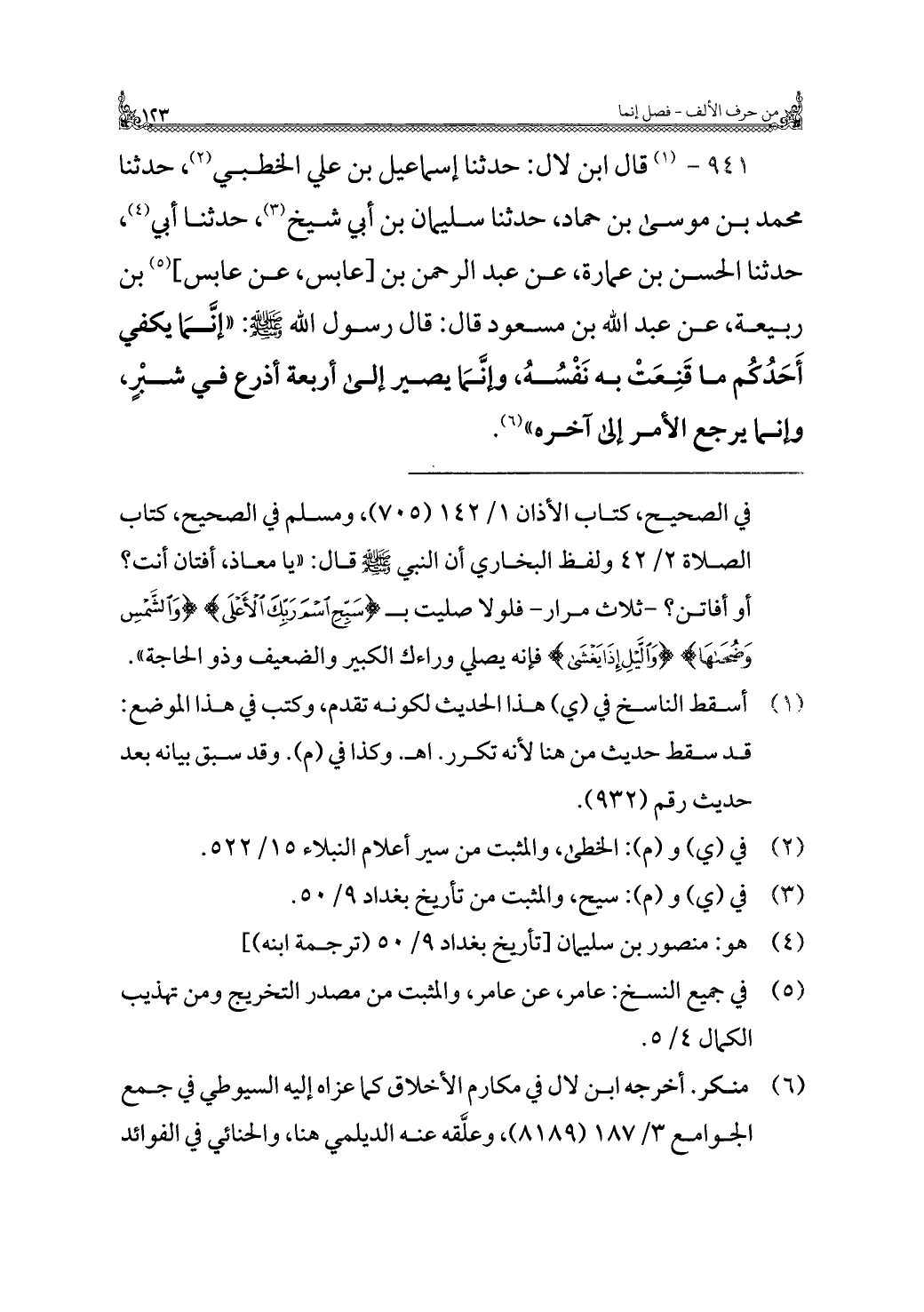 ٩٤١ - (¬١) قال ابن لال: حدثنا إسماعيل بن علي الخطبي (¬٢)، حدثنا محمد بن موسى بن حماد، حدثنا سليمان بن أبي شيخ (¬٣)، حدثنا أبي (¬٤)، حدثنا الحسن بن عمارة، عن عبد الرحمن بن [عابس، عن عابس] (¬٥) بن ربيعة، عن عبد الله بن مسعود قال: قال رسول الله - صلى الله عليه وسلم -: "إنَّما يكفي أَحَدُكُم ما قَنِعَتْ به نَفْسُهُ، وإنَّمَا يصير إلى أربعة أذرع في شبرٍ، وإنما يرجع الأمر إلى آخره" (¬٦).