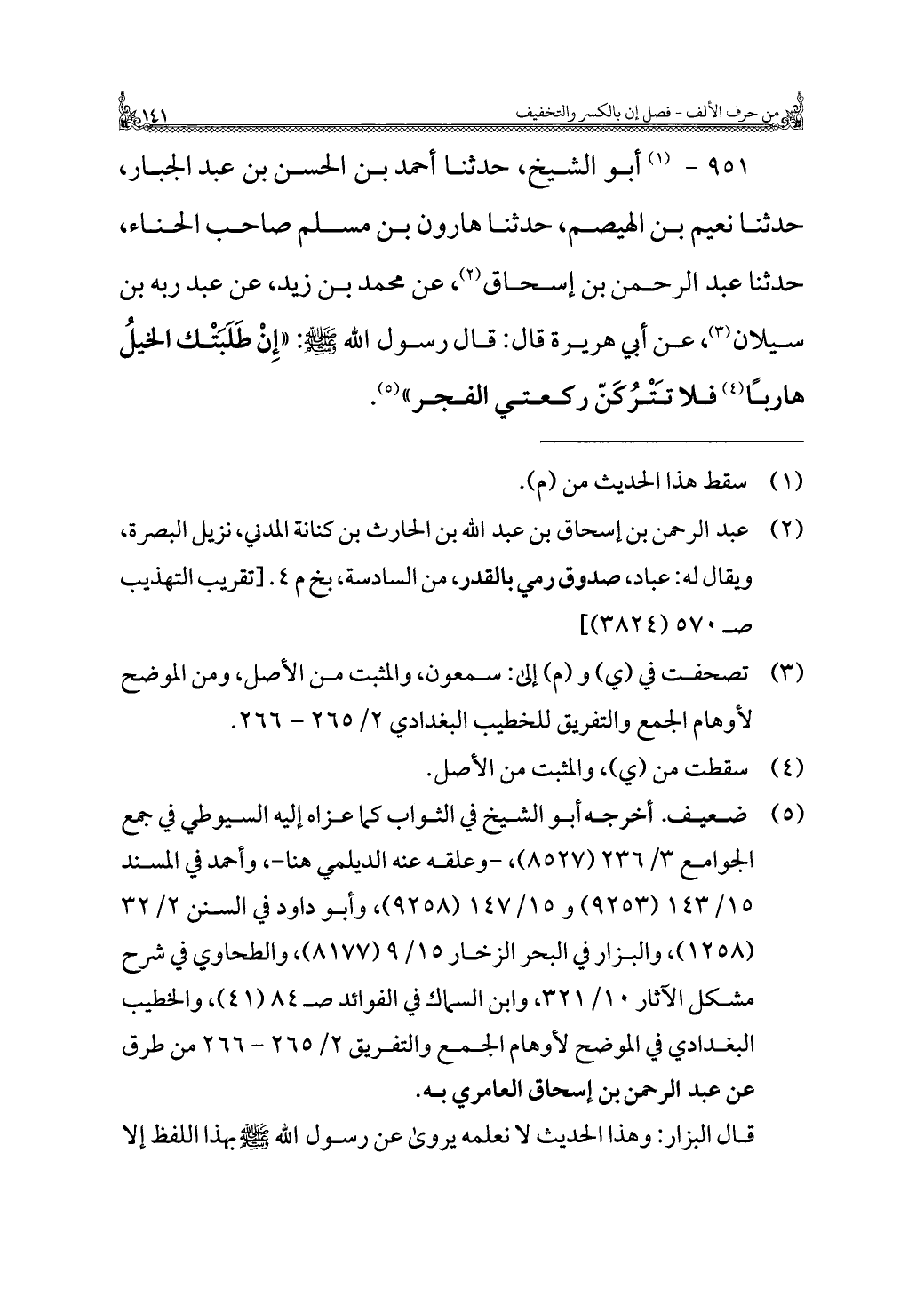 ٩٥١ - (¬١) أبو الشيخ، حدثنا أحمد بن الحسن بن عبد الجبار، حدثنا نعيم بن الهيصم، حدثنا هارون بن مسلم صاحب الحناء، حدثنا عبد الرحمن بن إسحاق (¬٢)، عن محمد بن زيد، عن عبد ربه بن سيلان (¬٣)، عن أبي هريرة قال: قال رسول الله - صلى الله عليه وسلم -: "إِنْ طَلَبَتْك الخيلُ هاربًا (¬٤) فلا تَتْرُكَنّ ركعتي الفجر" (¬٥).