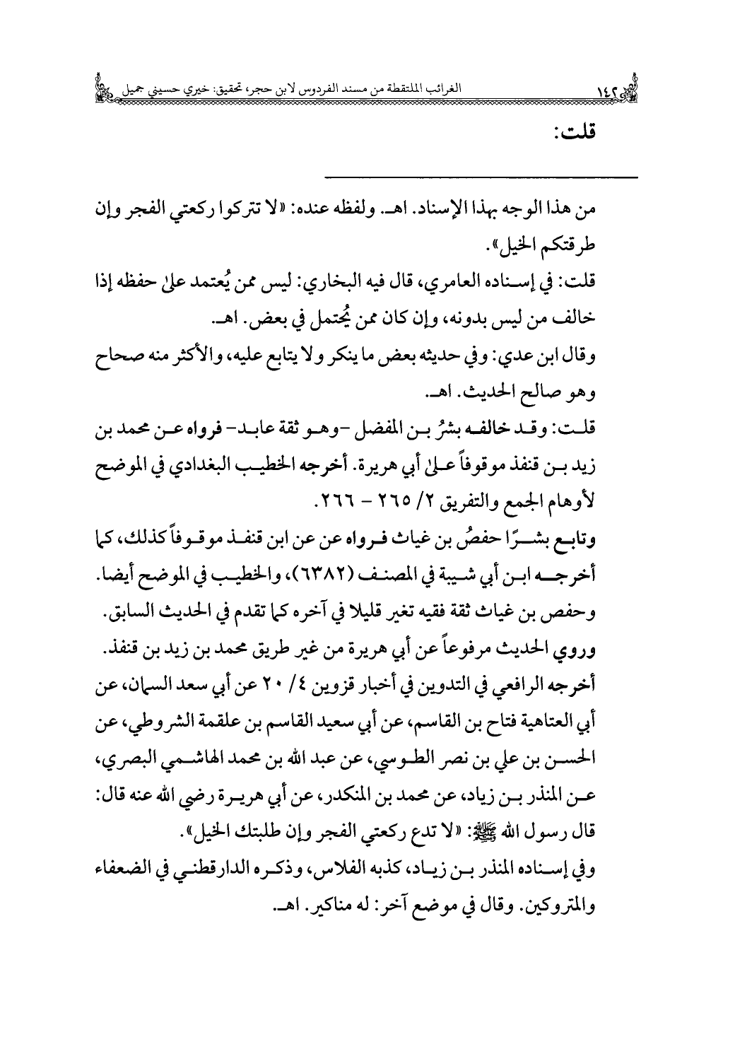 وتابع بشرًا حفصُ بن غياث فرواه عن عن ابن قنفذ موقوفًا كذلك، كما أخرجه ابن أبي شيبة في المصنف (٦٣٨٢)، والخطيب في الموضح أيضا. وحفص بن غياث ثقة فقيه تغير قليلا في آخره كما تقدم في الحديث السابق. وروي الحديث مرفوعًا عن أبي هريرة من غير طريق محمد بن زيد بن قنفذ. أخرجه الرافعي في التدوين في أخبار قزوين ٤/ ٢٠ عن أبي سعد السمان، عن أبي العتاهية فتاح بن القاسم، عن أبي سعيد القاسم بن علقمة الشروطي، عن الحسن بن علي بن نصر الطوسي، عن عبد الله بن محمد الهاشمي البصري، عن المنذر بن زياد، عن محمد بن المنكدر، عن أبي هريرة - رضي الله عنه - قال: قال رسول الله - صلى الله عليه وسلم -: "لا تدع ركعتي الفجر وإن طلبتك الخيل".