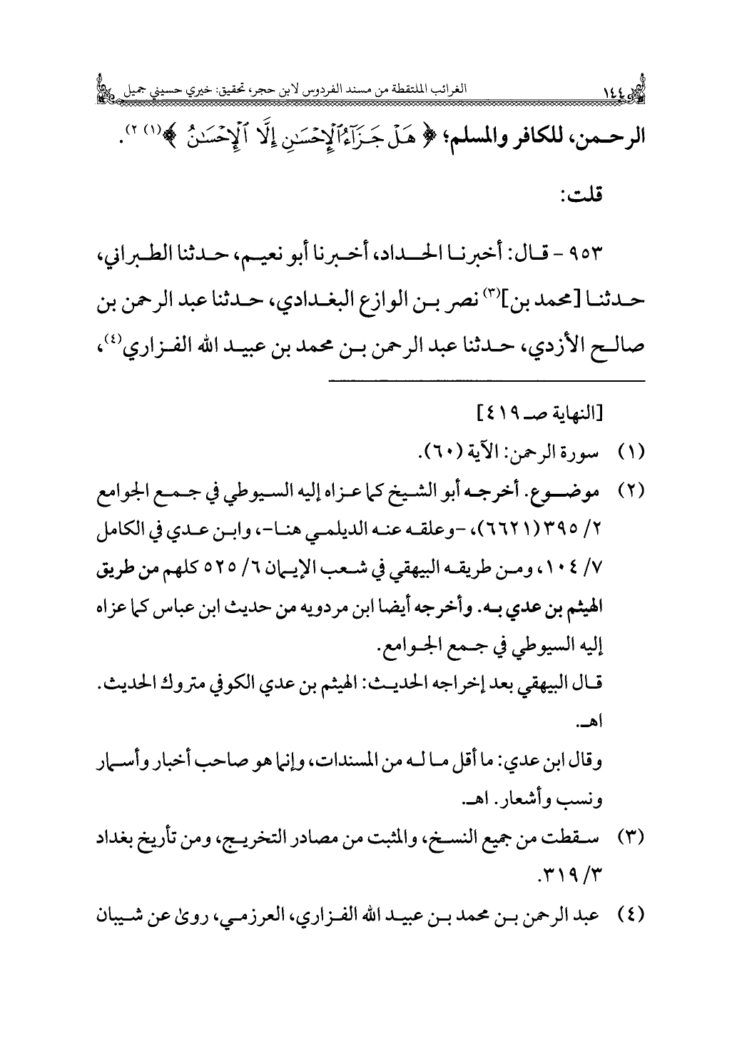 ٩٥٣ - قال: أخبرنا الحداد، أخبرنا أبو نعيم، حدثنا الطبراني، حدثنا [محمد بن] (¬٣) نصر بن الوازع البغدادي، حدثنا عبد الرحمن بن صالح الأزدي، حدثنا عبد الرحمن بن محمد بن عبيد الله الفزاري (¬٤)،
