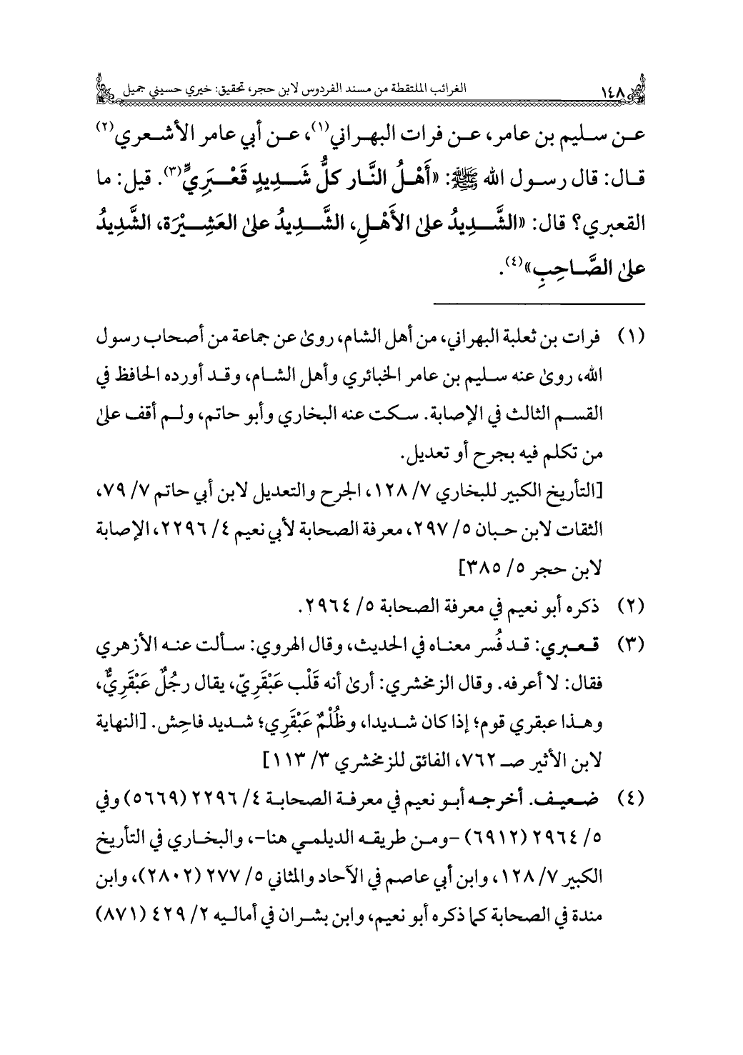 عن سليم بن عامر، عن فرات البهراني (¬١)، عن أبي عامر الأشعري (¬٢) قال: قال رسول الله - صلى الله عليه وسلم -: "أَهْلُ النَّار كلُّ شَدِيدٍ قَعْبَريٍّ (¬٣). قيل: ما القعبري؟ قال: "الشَّدِيدُ على الأَهْلِ، الشَّدِيدُ على العَشِيْرَة، الشَّدِيدُ على الصَّاحِبِ" (¬٤).