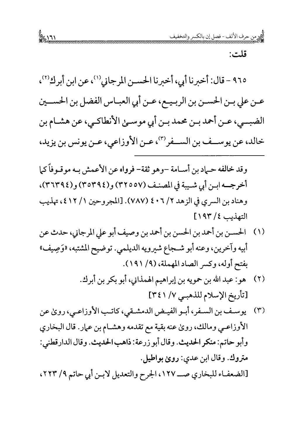 ٩٦٥ - قال: أخبرنا أبي، أخبرنا الحسن المرجاني (¬١)، عن ابن أبرك (¬٢)، عن علي بن الحسن بن الربيع، عن أبي العباس الفضل بن الحسين الضبي، عن أحمد بن محمد بن أبي موسى الأنطاكي، عن هشام بن خالد، عن يوسف بن السفر (¬٣)، عن الأوزاعي، عن يونس بن يزيد،