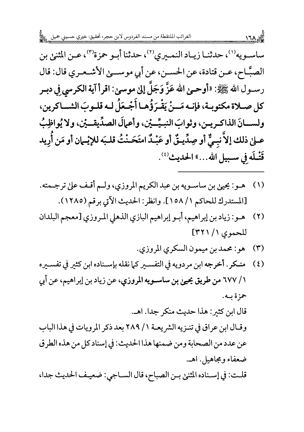 ساسويه (¬١)، حدثنا زياد النميري (¬٢)، حدثنا أبو حمزة (¬٣)، عن المثنى بن الصبَّاح، عن قتادة، عن الحسن، عن أبي موسى الأشعري قال: قال رسول الله - صلى الله عليه وسلم -: "أوحى الله عَزَّ وَجَلَّ إلى موسى: اقرأ آية الكرسي فِي دبر كل صلاة مكتوبة، فانه مَنْ يَقْرَؤُها أَجْعَلُ له قلوبَ الشاكرين، ولسانَ الذاكرين، وثوابَ النبيِّيْن، وأعمالَ الصدِّيقيْن، ولا يُواظِبُ على ذلك إلَّا نبِيٌّ أو صِدِّيقٌ أو عَبْدٌ امتَحَنْتُ قلبَه للإيْمان أو مَن أُرِيد قَتْلَه فِي سبيل الله ... " الحديث (¬٤).