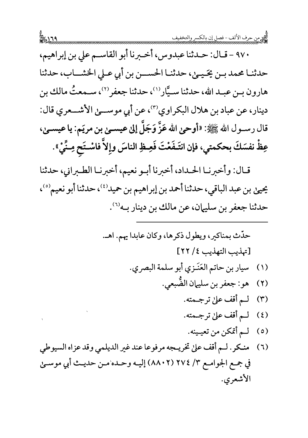 ٩٧٠ - قال: حدثنا عبدوس، أخبرنا أبو القاسم علي بن إبراهيم، حدثنا محمد بن يحيى، حدثنا الحسن بن أبي علي الخشاب، حدثنا هارون بن عبد الله، حدثنا سيَّار (¬١)، حدثنا جعفر (¬٢)، سمعتُ مالك بن دينار، عن عباد بن هلال البكراوي (¬٣)، عن أبي موسى الأشعري قال: قال رسول الله - صلى الله عليه وسلم -: "أوحى الله عَزَّ وَجَلَّ إلي عيسى بن مريَم: يا عيسى، عِظْ نفسَكَ بحكمتي، فإن انتَفَعْتَ فَعِظِ الناسَ وإِلَّا فاسْتَحِ مِنِّيْ".