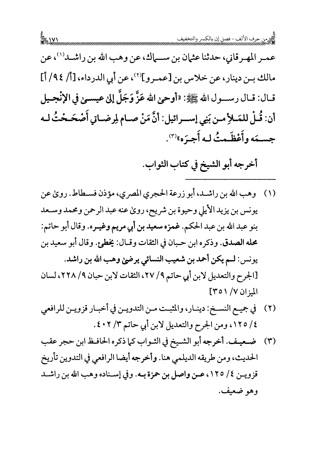 (¬٣) ضعيف. أخرجه أبو الشيخ في الثواب كما ذكره الحافظ ابن حجر عقب الحديث، ومن طريقه الديلمي هنا. وأخرجه أيضا الرافعي في التدوين تأريخ قزوين ٤/ ١٢٥، عن واصل بن حمزة به. وفي إسناده وهب الله بن راشد وهو ضعيف.