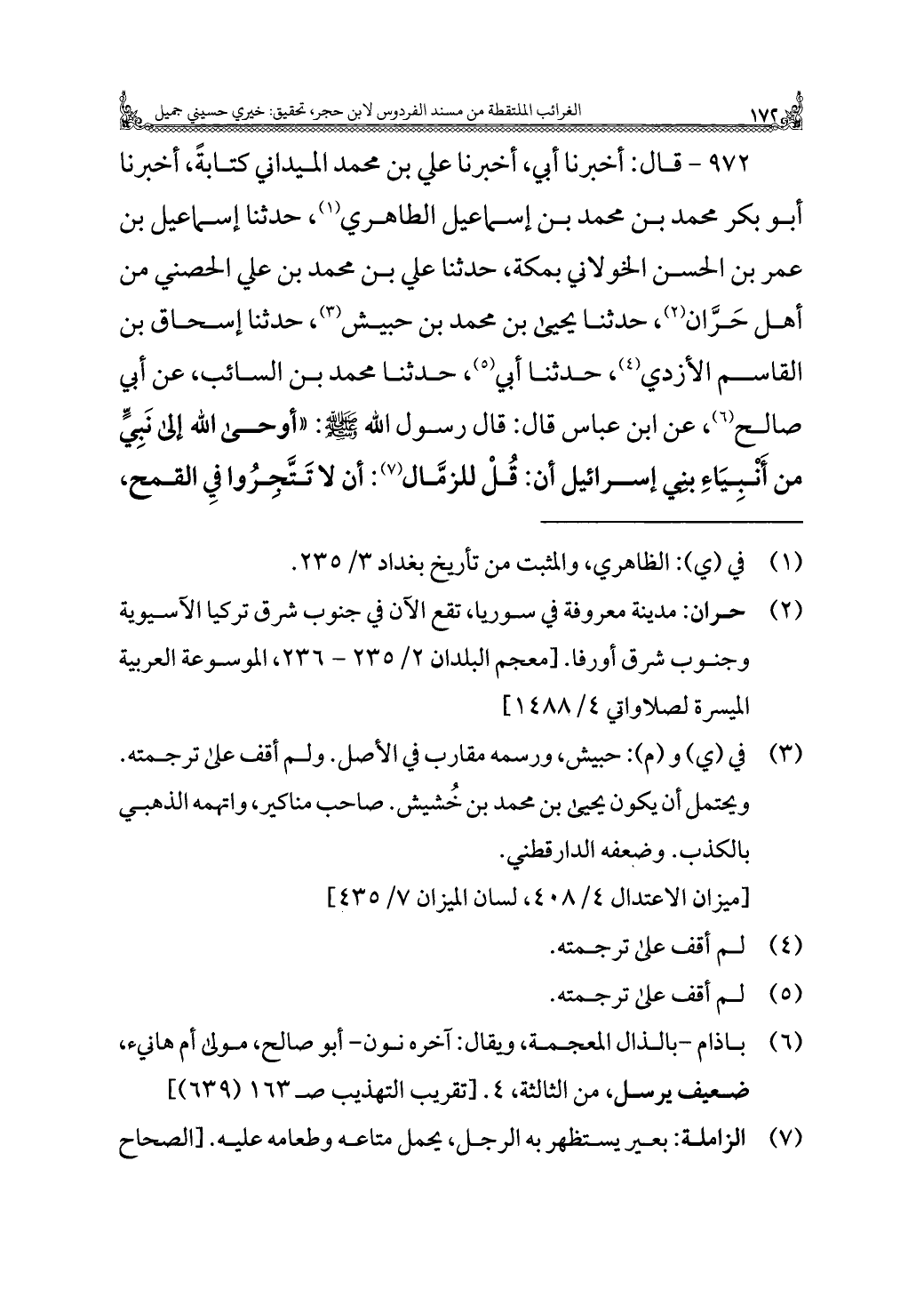 ٩٧٢ - قال: أخبرنا أبي، أخبرنا علي بن محمد الميداني كتابةً، أخبرنا أبو بكر محمد بن محمد بن إسماعيل الطاهري (¬١)، حدثنا إسماعيل بن عمر بن الحسن الخولاني بمكة، حدثنا علي بن محمد بن علي الحصني من أهل حَرَّان (¬٢)، حدثنا يحيى بن محمد بن حبيش (¬٣)، حدثنا إسحاق بن القاسم الأزدي (¬٤)، حدثنا أبي (¬٥)، حدثنا محمد بن السائب، عن أبي صالح (¬٦)، عن ابن عباس قال: قال رسول الله - صلى الله عليه وسلم -: "أوحى الله إلي نَبِيٍّ من أَنبِيَاءِ بنِي إسرائيل أن: قُلْ للزمَّال (¬٧): أن لا تَتَّجرُوا فِي القمح،