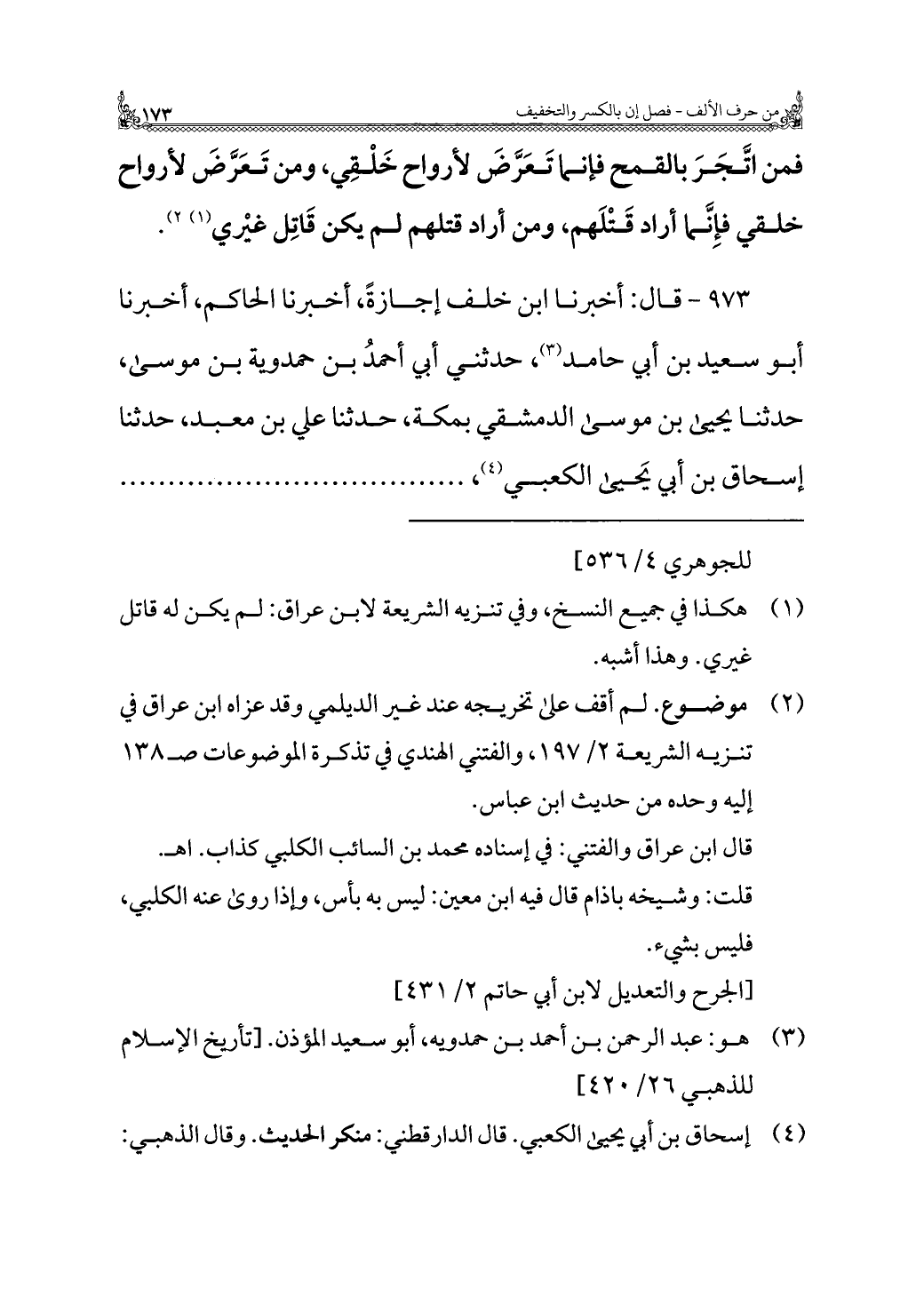 ٩٧٣ - قال: أخبرنا ابن خلف إجازةً، أخبرنا الحاكم، أخبرنا أبو سعيد بن أبي حامد (¬٣)، حدثني أبي أحمدُ بن حمدوية بن موسى، حدثنا يحيى بن موسى الدمشقي بمكة، حدثنا علي بن معبد، حدثنا إسحاق بن أبي يَحيى الكعبي (¬٤)،