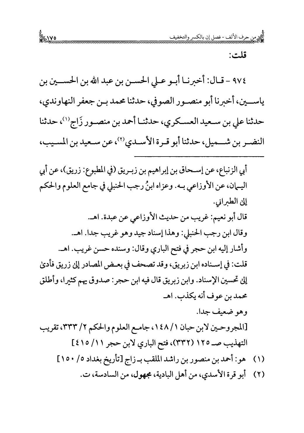 ٩٧٤ - قال: أخبرنا أبو علي الحسن بن عبد الله بن الحسين بن ياسين، أخبرنا أبو منصور الصوفي، حدثنا محمد بن جعفر النهاوندي، حدثنا علي بن سعيد العسكري، حدثنا أحمد بن منصور زَاج (¬١)، حدثنا النضر بن شميل، حدثنا أبو قرة الأسدي (¬٢)، عن سعيد بن المسيب،