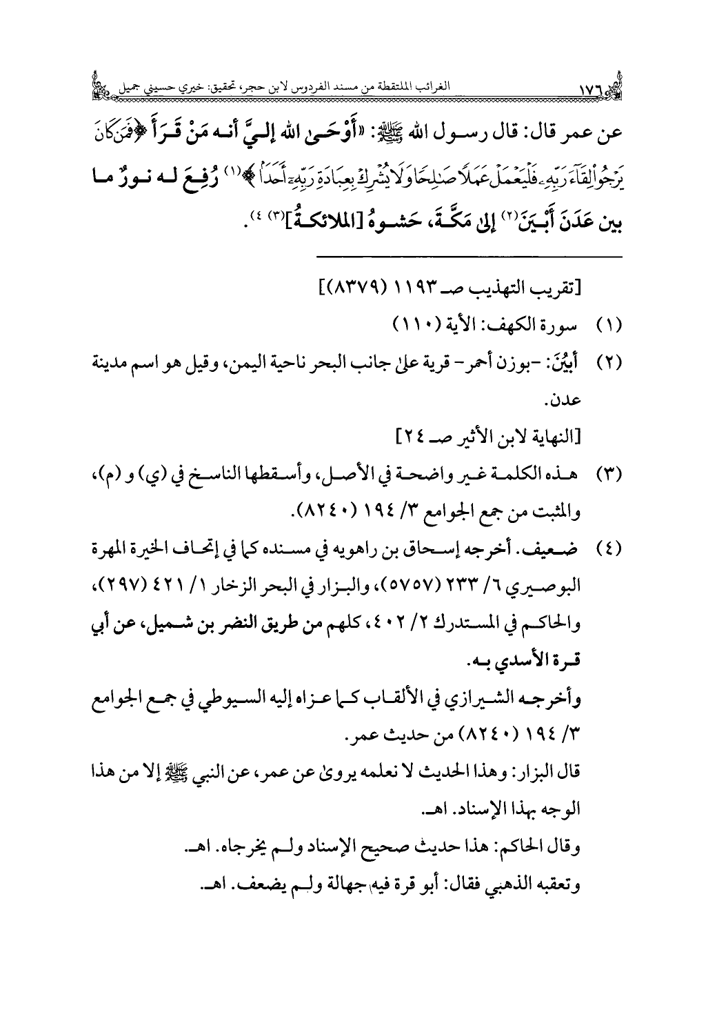 عن عمر قال: قال رسول الله - صلى الله عليه وسلم -: "أَوْحَى الله إليَّ أنه مَنْ قَرَأَ {فَمَنْ كَانَ يَرْجُو لِقَاءَ رَبِّهِ فَلْيَعْمَلْ عَمَلًا صَالِحًا وَلَا يُشْرِكْ بِعِبَادَةِ رَبِّهِ أَحَدًا} (¬١) رُفِعَ له نورٌ ما بين عَدَنَ أَبْيَنَ (¬٢) إلى مَكَّةَ، حَشوهُ [الملائكةُ] (¬٣)] (¬٤).