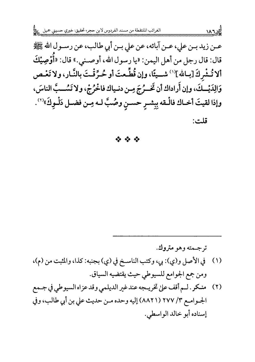 عن زيد بن علي، عن آبائه، عن علي بن أبي طالب، عن رسول الله - صلى الله عليه وسلم - قال: قال رجل من أهل اليمن: "يا رسول الله، أوصني." قال: "أُوْصِيْكَ ألا تُشْرِكَ [بالله] (¬١) شيئًا، وإن قُطعتَ أو حُرِّقْتَ بالنَّار، ولا تَعْص وَالِدَيْكَ، وإن أَراداك أن تَخرُجَ مِن دنياك فاخْرُجْ، ولا تَسُبَّ الناسَ، وإذا لقيتَ أخاك فالْقه بِبِشرٍ حسنٍ وصُبَّ له مِن فضل دَلْوِكَ" (¬٢).