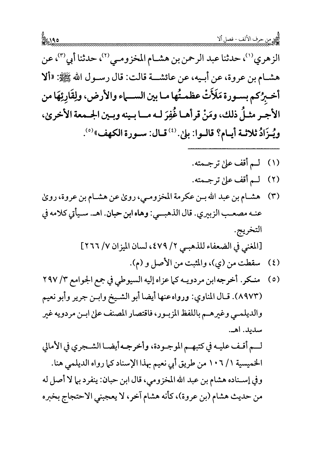 الزهري (¬١)، حدثنا عبد الرحمن بن هشام المخزومي (¬٢)، حدثنا أبي (¬٣)، عن هشام بن عروة، عن أبيه، عن عائشة قالت: قال رسول الله - صلى الله عليه وسلم -: "ألا أخبِرُكم بسورة مَلَأَتْ عظمتُها ما بين السماء والأرض، ولِقَارِئِهَا من الأجر مثلُ ذلك، ومَنْ قرأها غُفِرَ له ما بينه وبين الجمعة الأخرى، ويُزَادُ ثلاثة أيام؟ قالوا: بك. (¬٤) قال: سورة الكهف" (¬٥).