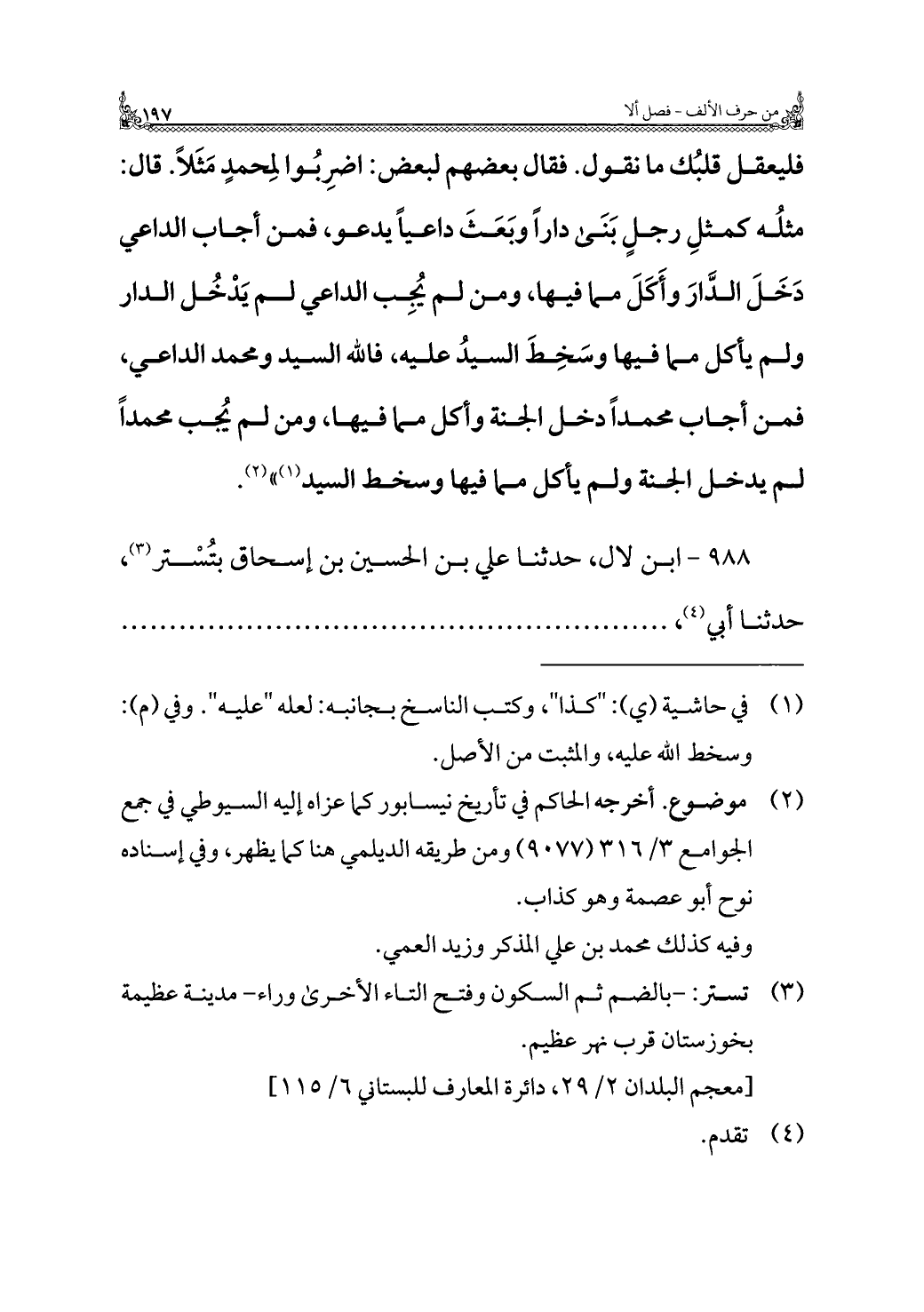 ٩٨٨ - ابن لال، حدثنا علي بن الحسين بن إسحاق بتُسْتر (¬٣)، حدثنا أبي (¬٤)،