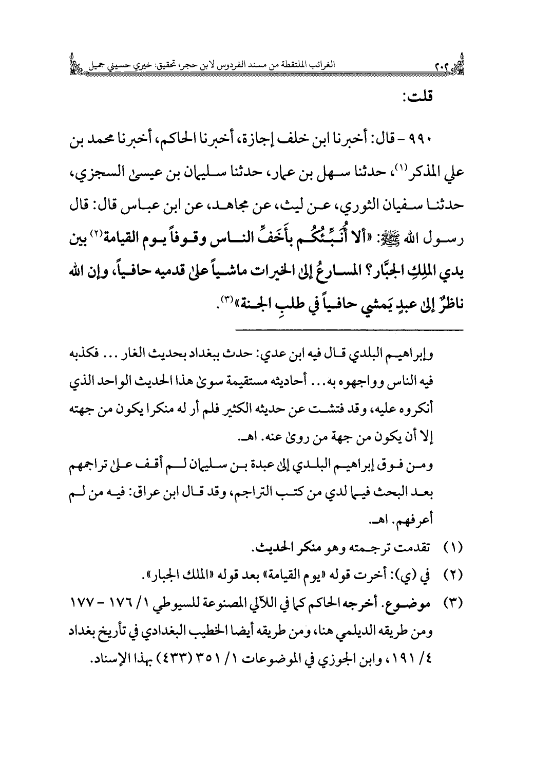 ٩٩٠ - قال: أخبرنا ابن خلف إجازة، أخبرنا الحاكم، أخبرنا محمد بن علي المذكر (¬١)، حدثنا سهل بن عمار، حدثنا سليمان بن عيسى السجزي، حدثنا سفيان الثوري، عن ليث، عن مجاهد، عن ابن عباس قال: قال رسول الله - صلى الله عليه وسلم -: "ألا أُنبِّئكُم بأَخَفِّ الناس وقوفًا يوم القيامة (¬٢) بين يدي الملِكِ الجبَّار؟ المسارعُ إلى الخيرات ماشيًا علي قدميه حافيًا، وإن الله ناظرٌ إلى عبدٍ يَمشي حافيًا في طلبِ الجنة" (¬٣).